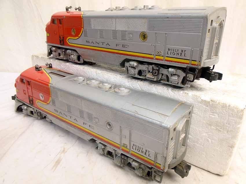 These are the #2343 Santa Fe F3 AA Diesels (1 has Original Portholes/1 has reproductions) that Lionel made in the early 1950s. Dual Motors, Magnetraction, and Horn. No Boxes. Examine very, very closely; what is pictured is what you will receive. Please add $45.00 for US-48 Shipping and Insurance (more west of the Mississippi).