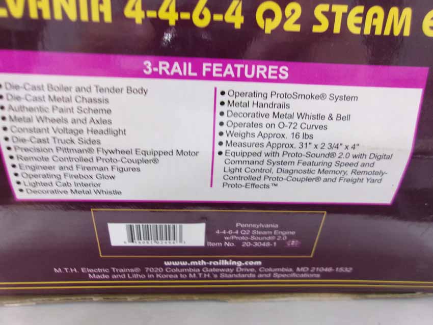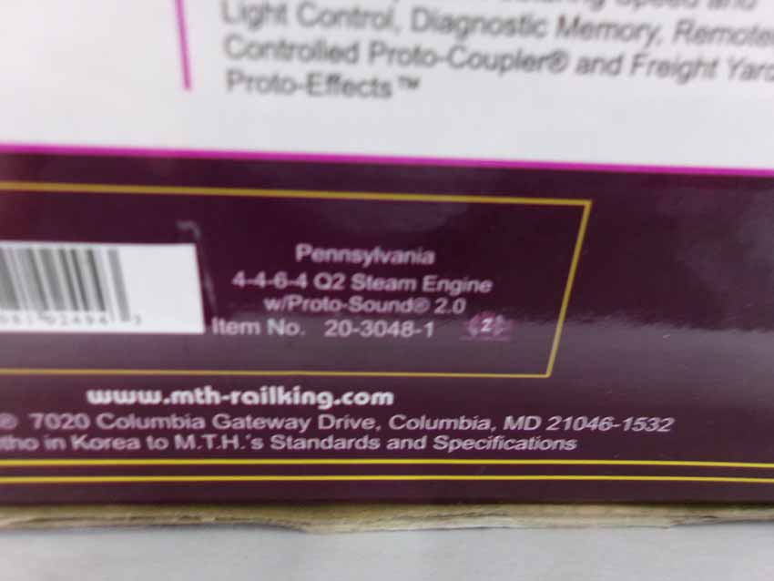 These are the #20-3048-1 (6193) Pennsylvania 4-4-6-4 Q2 Steam Engine and Tender that MTH made a few years ago. Features Protosound and Protosmoke. Our Opinion is that they are generally in Like New Condition. Original Box. All Original in our Opinion. Please add $50.00 for US-48 Shipping and Insurance (more west of the Mississippi).