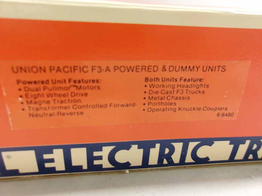 These are the #8480/8481 UP F-3 ABA Diesels & eight Passenger Cars that Lionel made in the middle 1980s. Included are the #9545/9546/9547/9548/9549/7210/19121/19152 UP Passenger Cars. Our Opinion is that they are generally in Like New Condition. Original Boxes. All Original in our Opinion. Please add $100.00 for US-48 Shipping and Insurance (more west of the Mississippi).