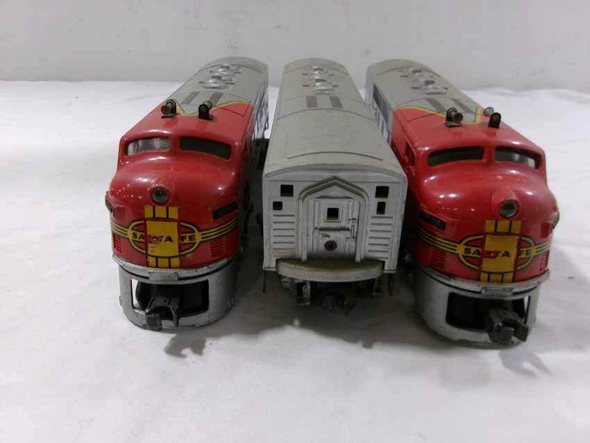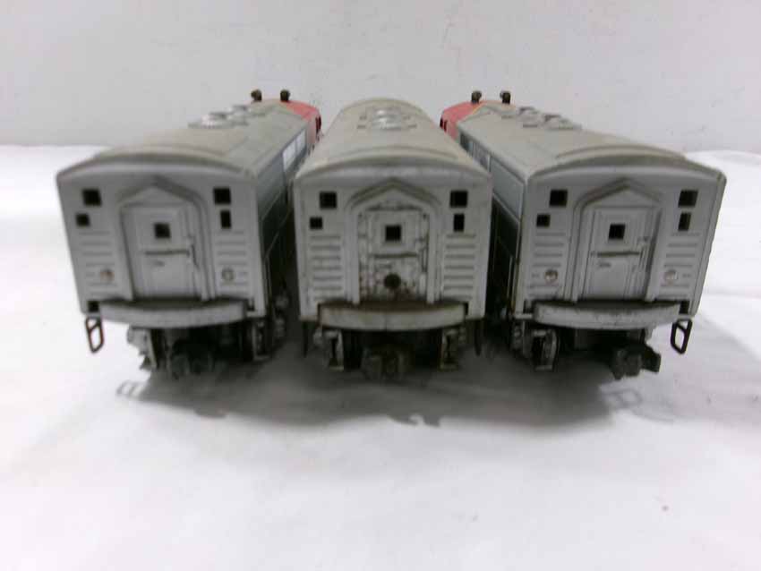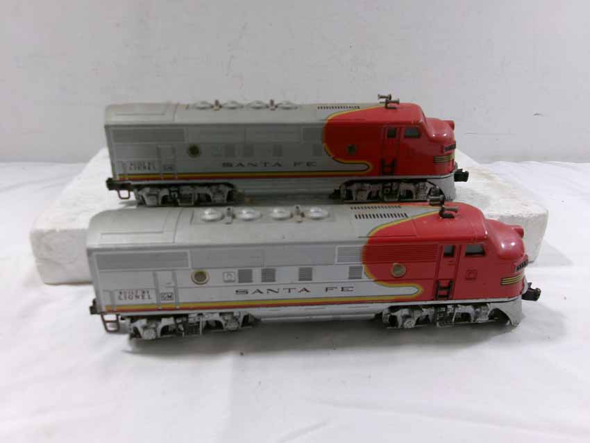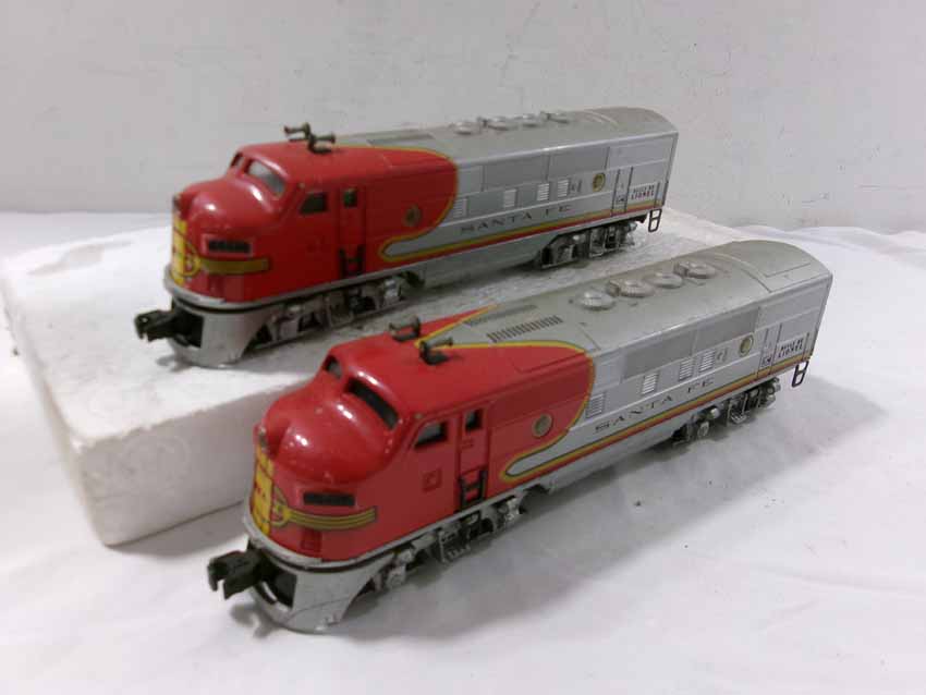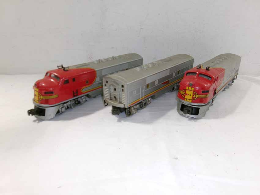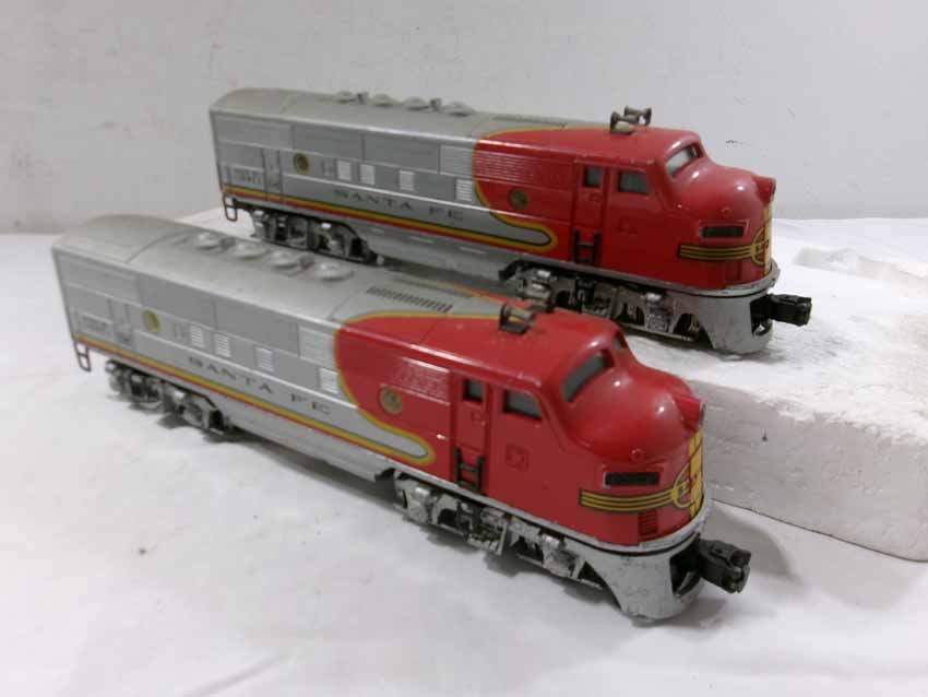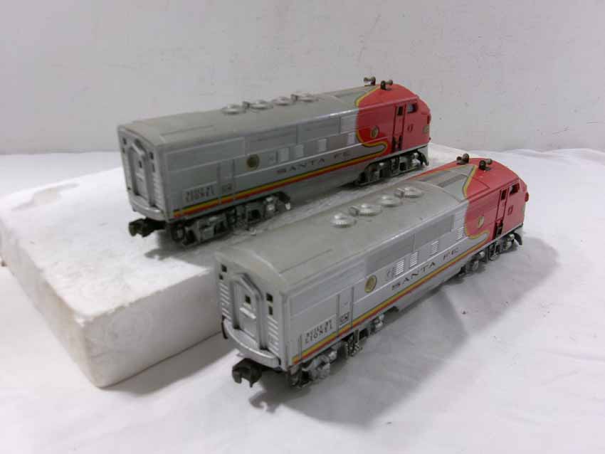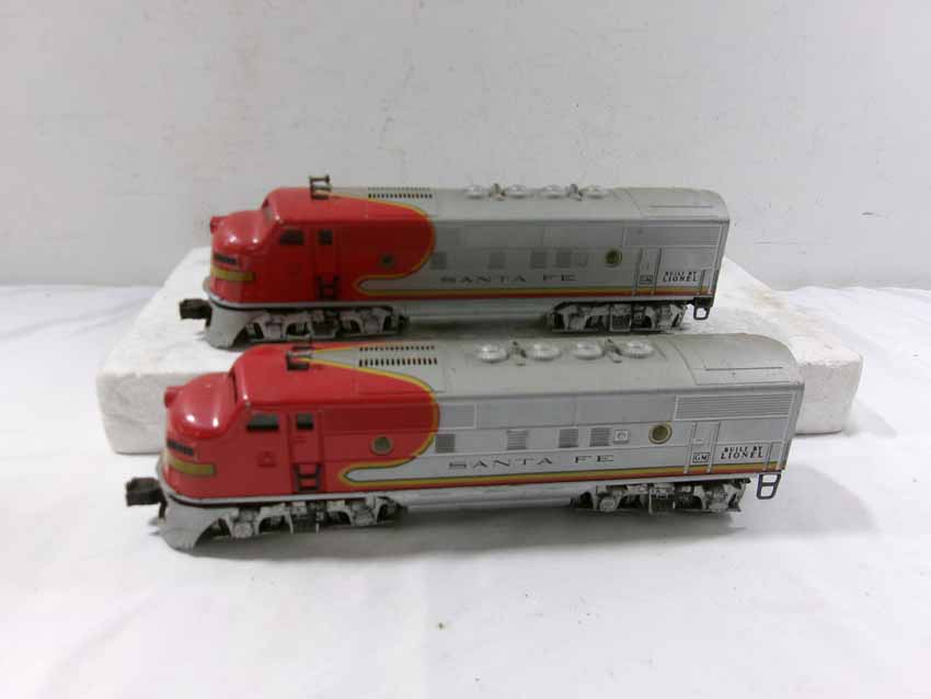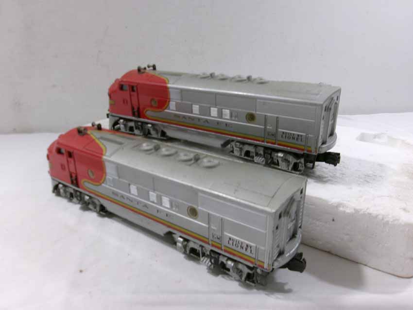 These are the Lionel #2353 SF F3 ABA Diesel Engines from the middle 1950s. Dual Motors wit Magnetraction and Horn. No Boxes. Examine very closely; what is pictured is what you will receive. Please add $50.00 for US-48 Shipping and Insurance (more west of the Mississippi).
