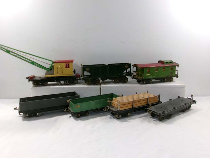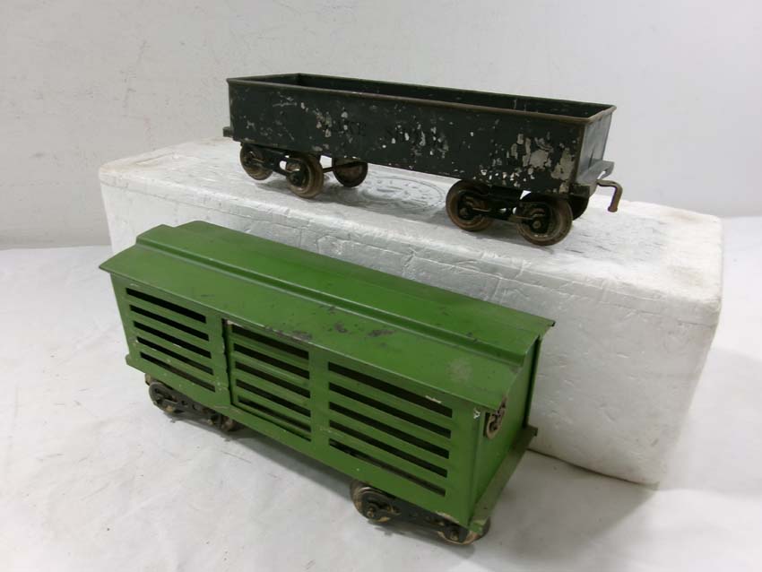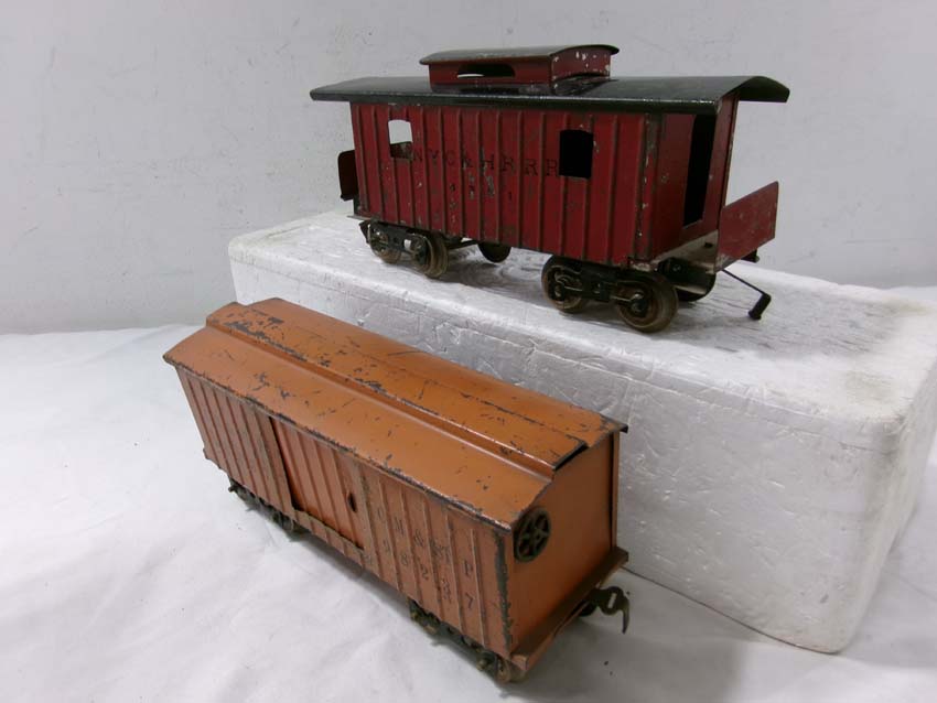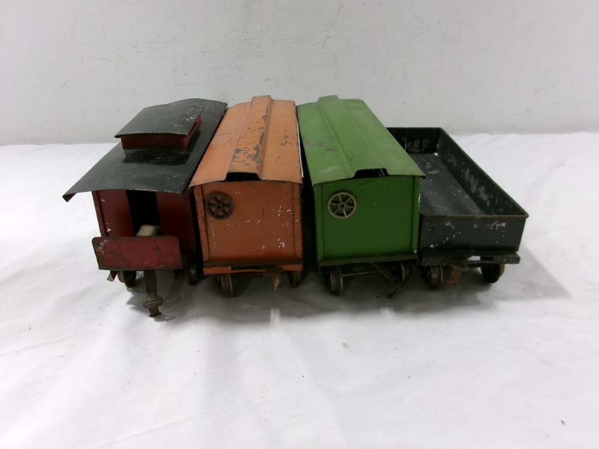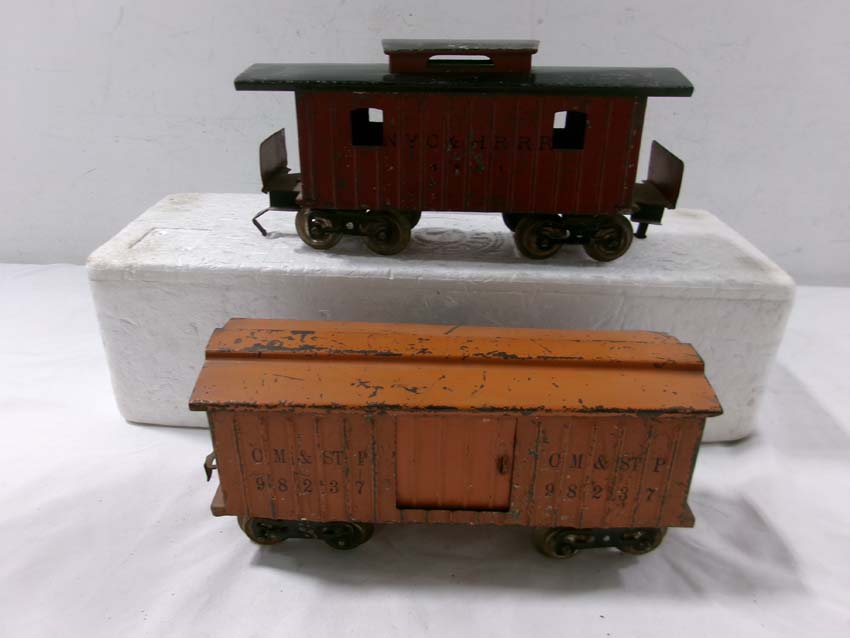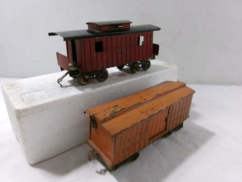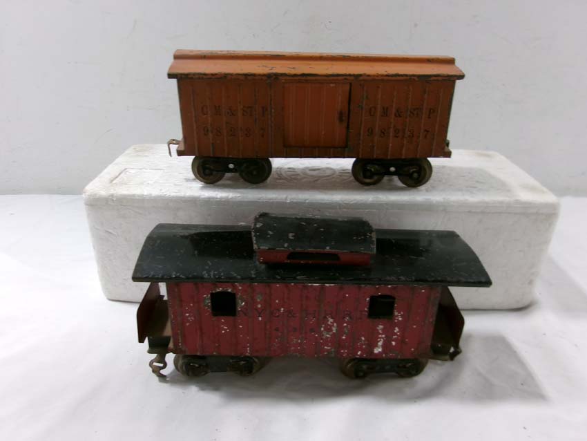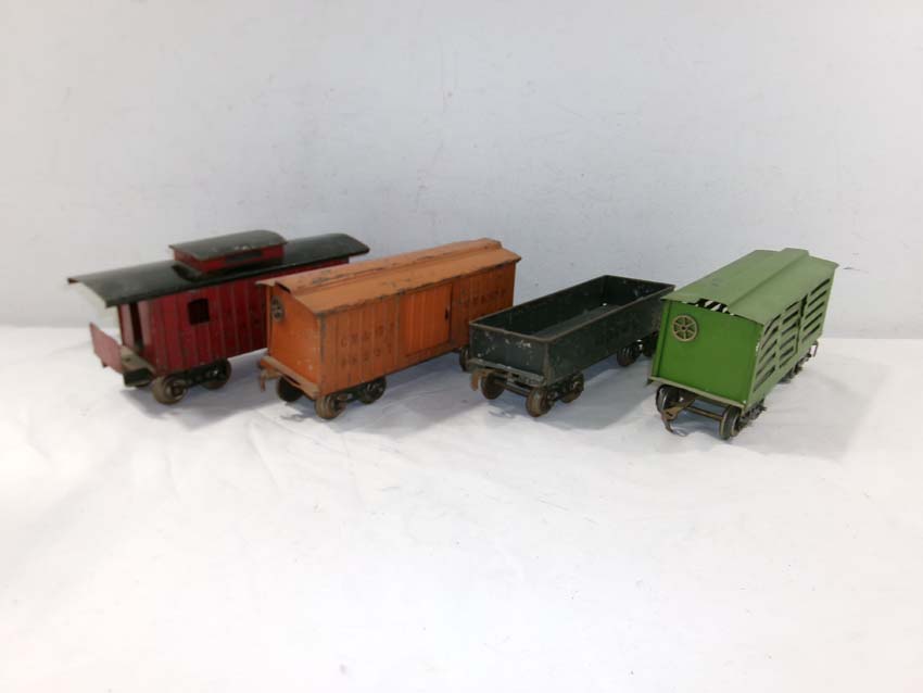 These are the Standard Gauge #112 Lake Shore Gondola, #113 Cattle Car, #114 CM&StP Box Car and #117 NYC&HRRR Caboose that Lionel made in the 1910s/20s. No Boxes. Examine very closely; what is pictured is what you will receive. Please add $50.00 for US-48 Shipping and Insurance (more west of the Mississippi). |
