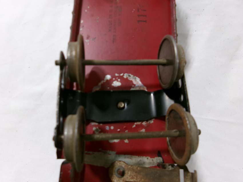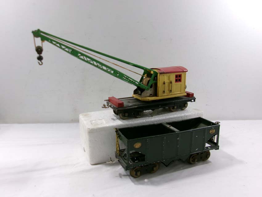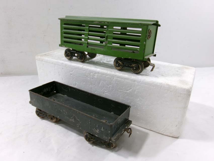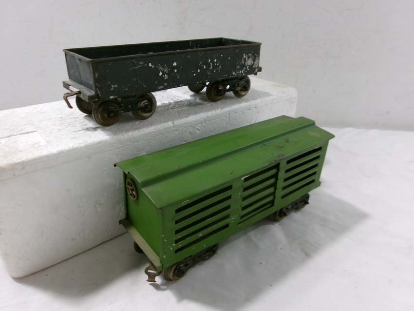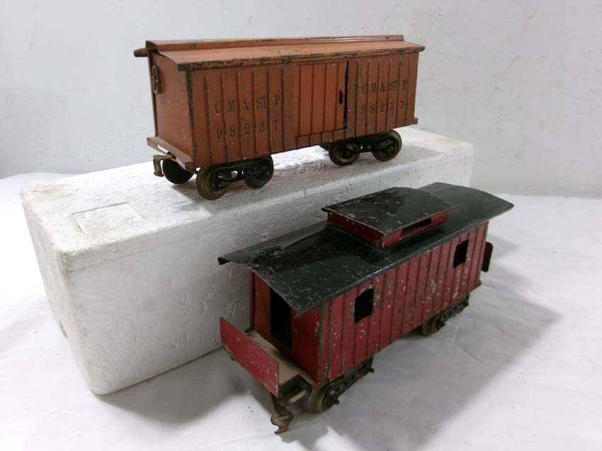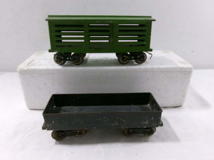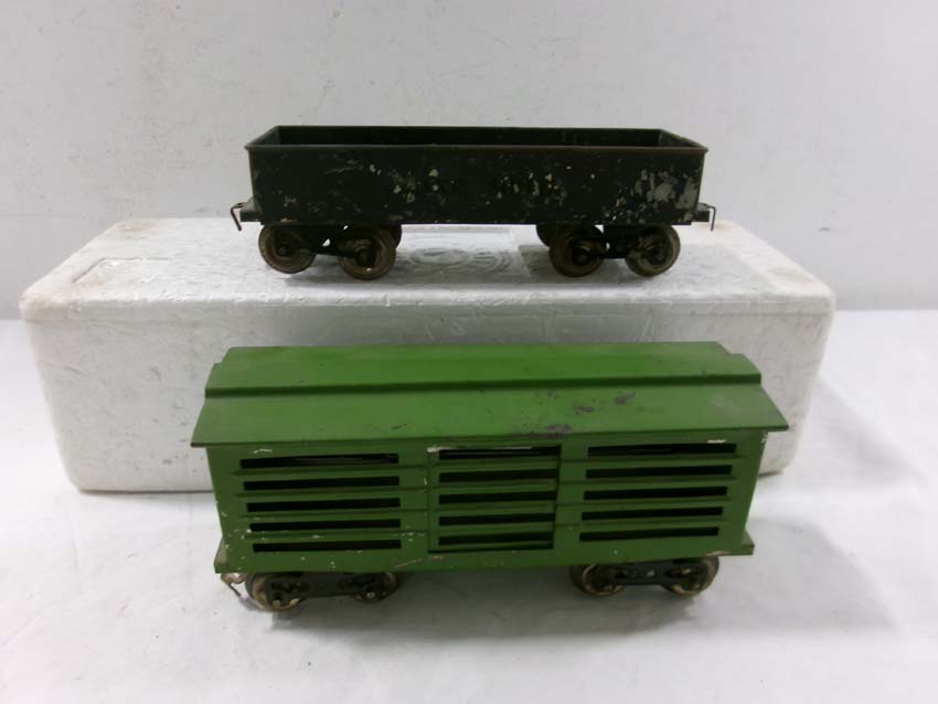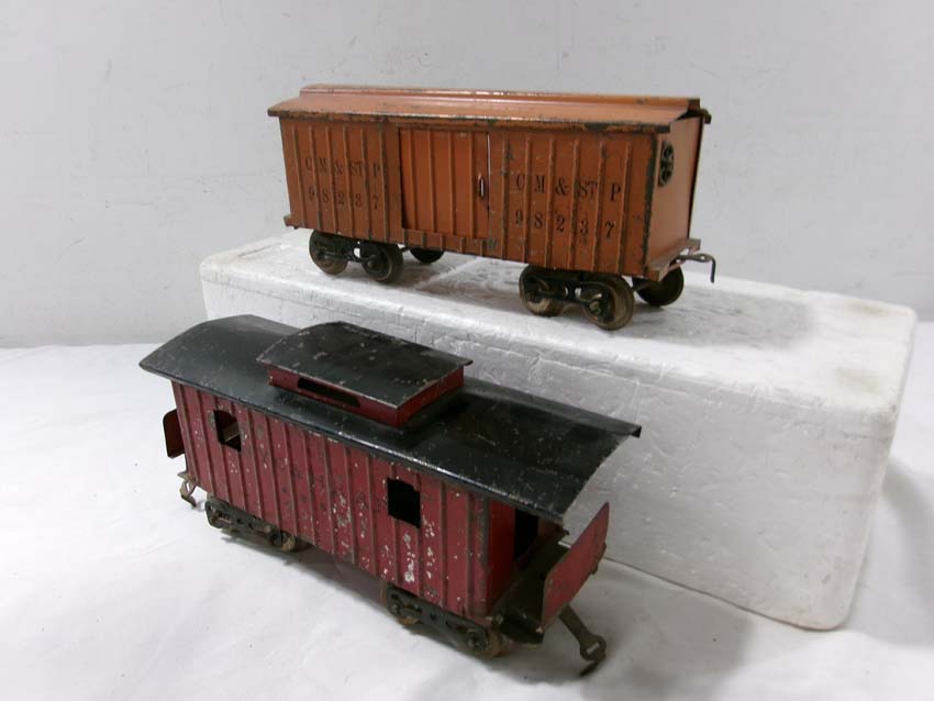 These are the Standard Gauge #112 Lake Shore Gondola, #113 Cattle Car, #114 CM&StP Box Car and #117 NYC&HRRR Caboose that Lionel made in the 1910s/20s. No Boxes. Examine very closely; what is pictured is what you will receive. Please add $50.00 for US-48 Shipping and Insurance (more west of the Mississippi). |