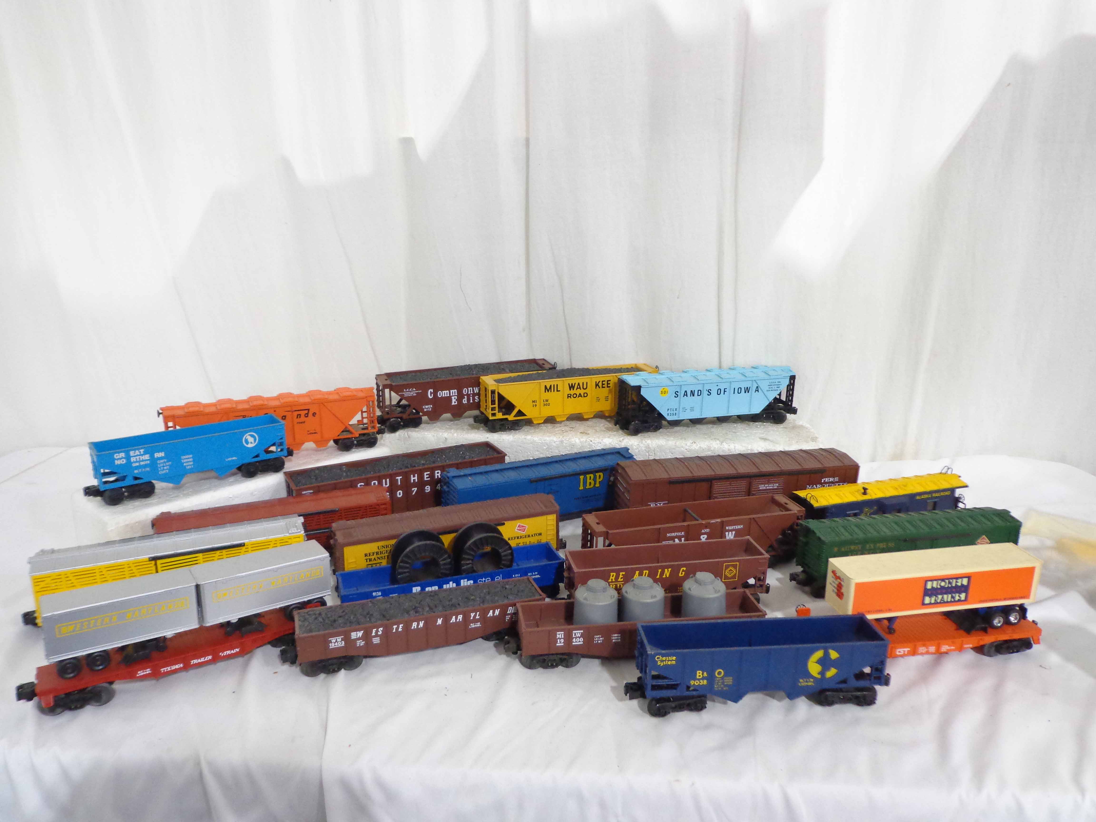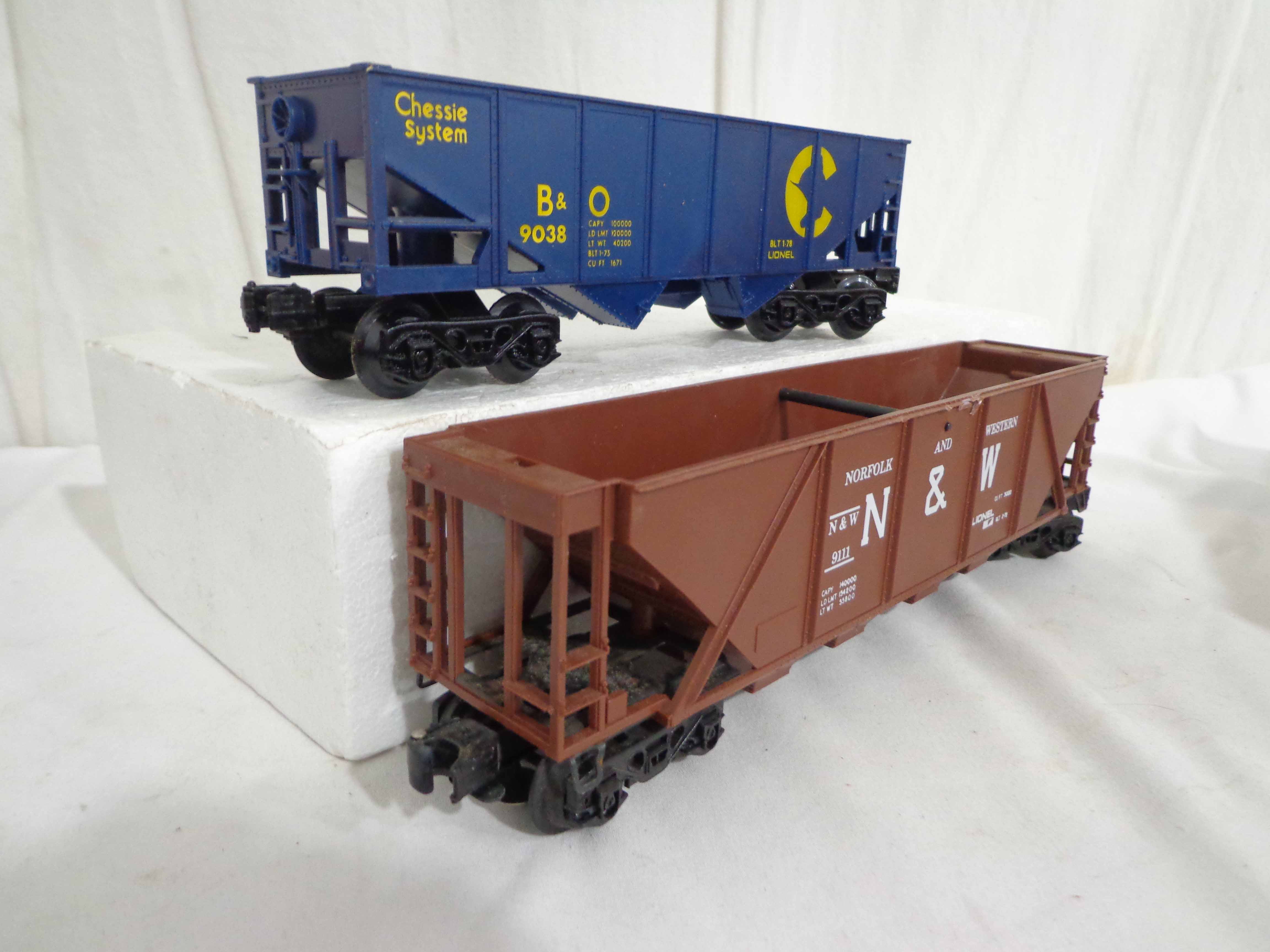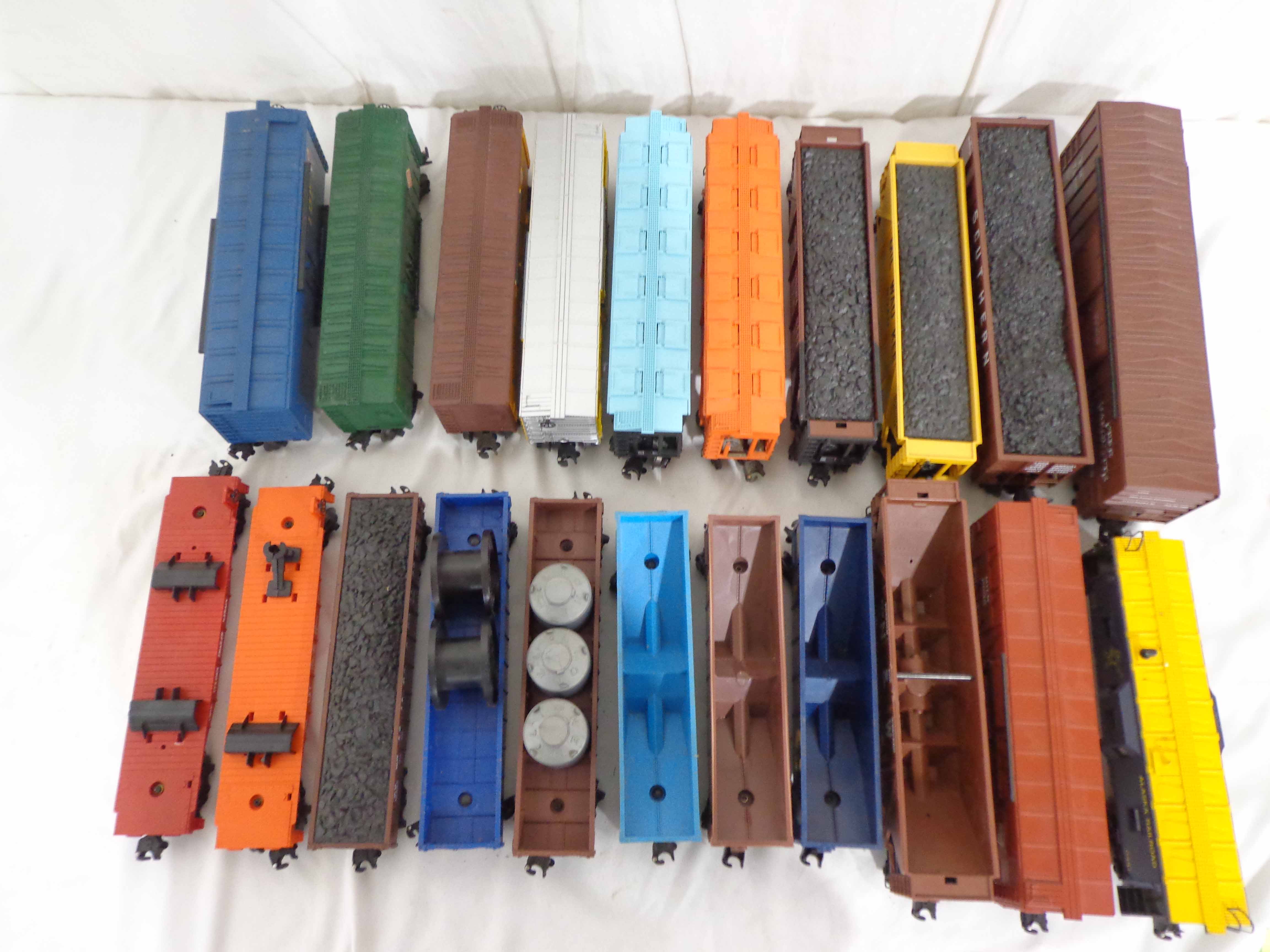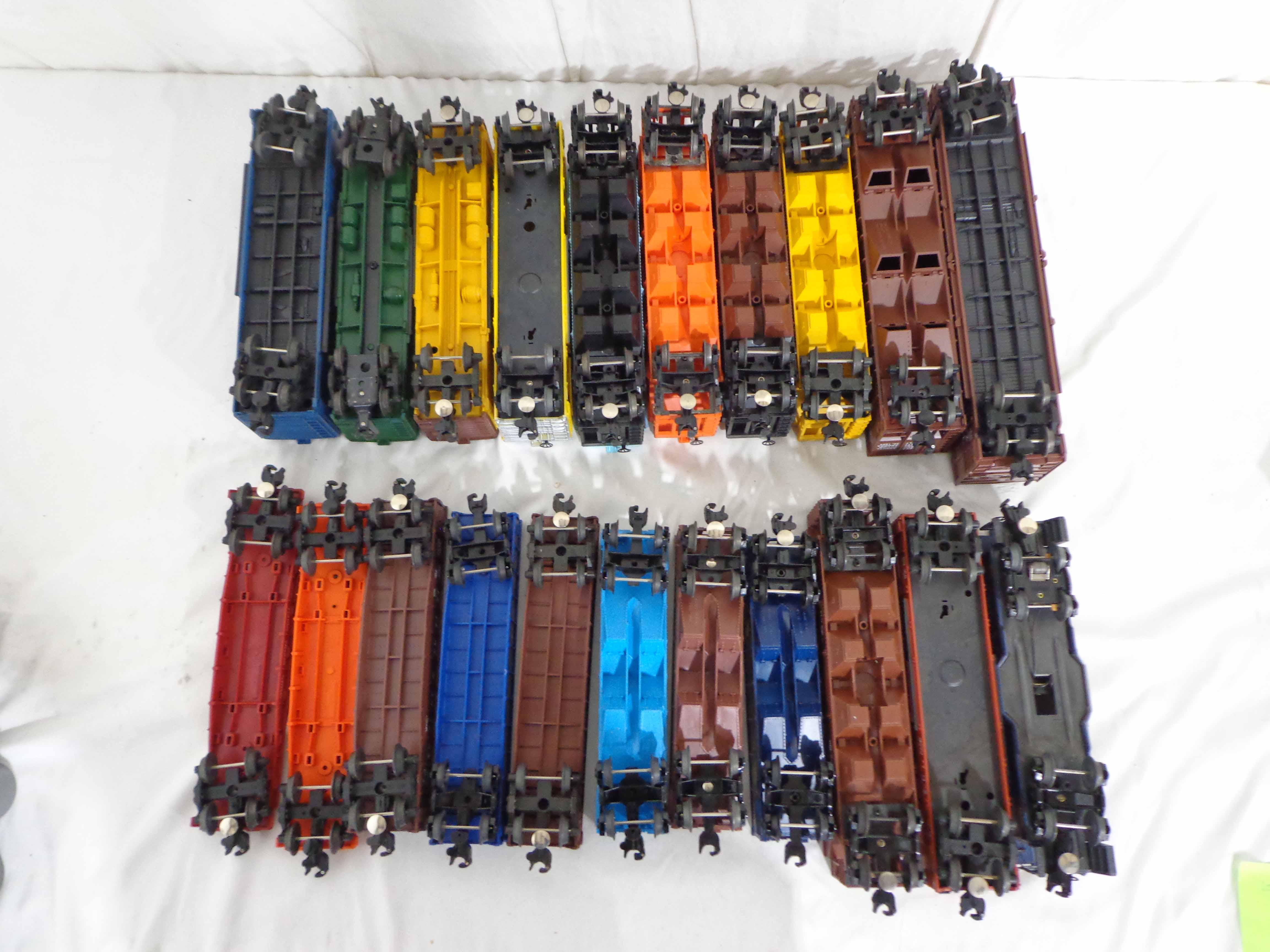 These are twenty-one Assorted Cars that Lionel made a few years ago. Our Opinion is that they are generally in Excellent Condition. No Boxes. Examine closely; what is pictured is what you will receive. Please add $60.00 for US-48 Shipping and Insurance (more west of the Mississippi). |