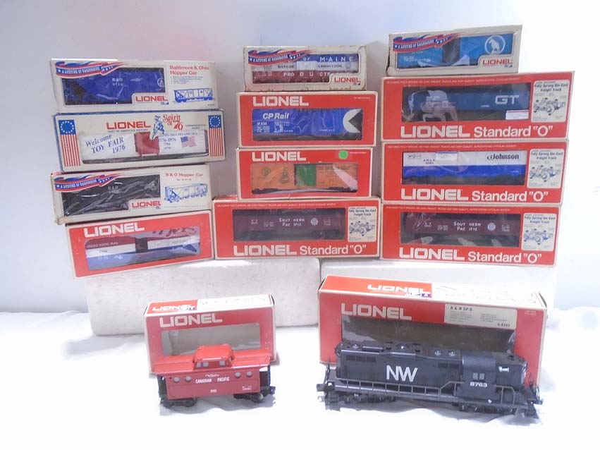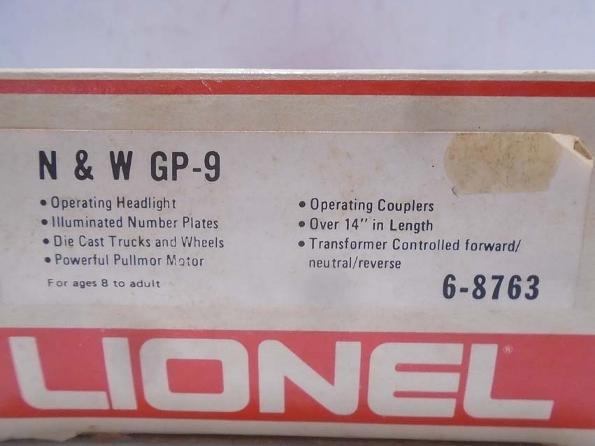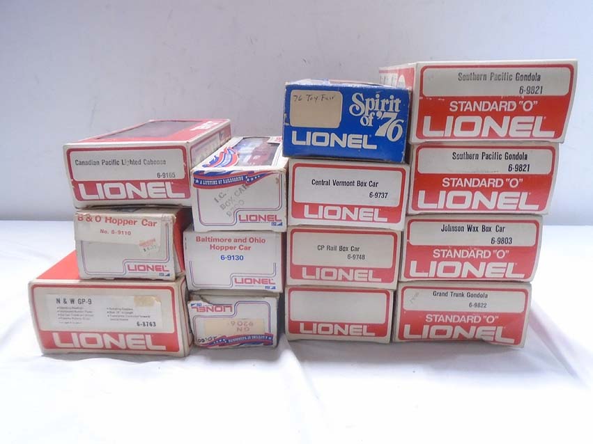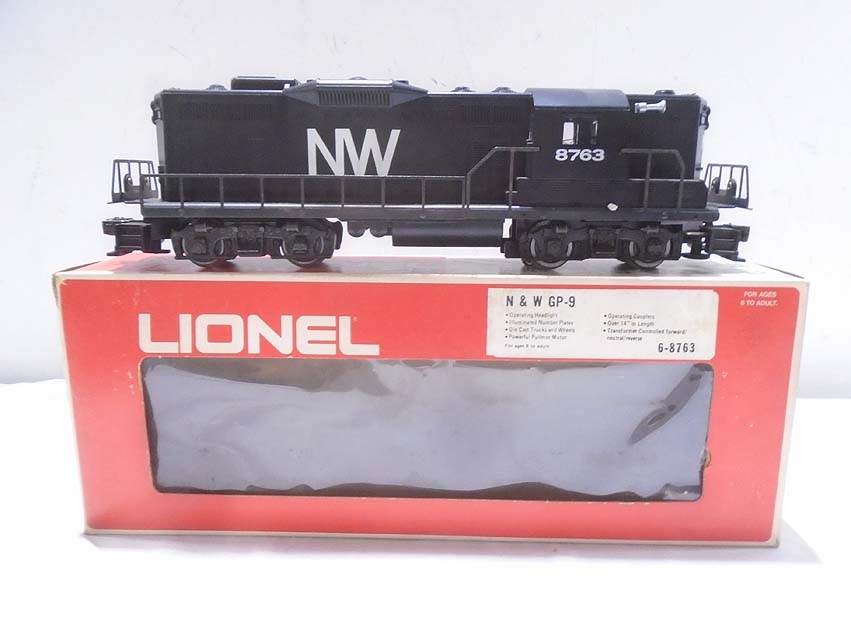 These are the #8763 N&W GP-9 Diesel Engine and thirteen Assorted Freight Cars that Lionel made a few years ago. Our Opinion is that they are generally in Excellent Plus Condition. Original Boxes. All Original in our Opinion. Please add $50.00 for US-48 Shipping and Insurance (more west of the Mississippi).