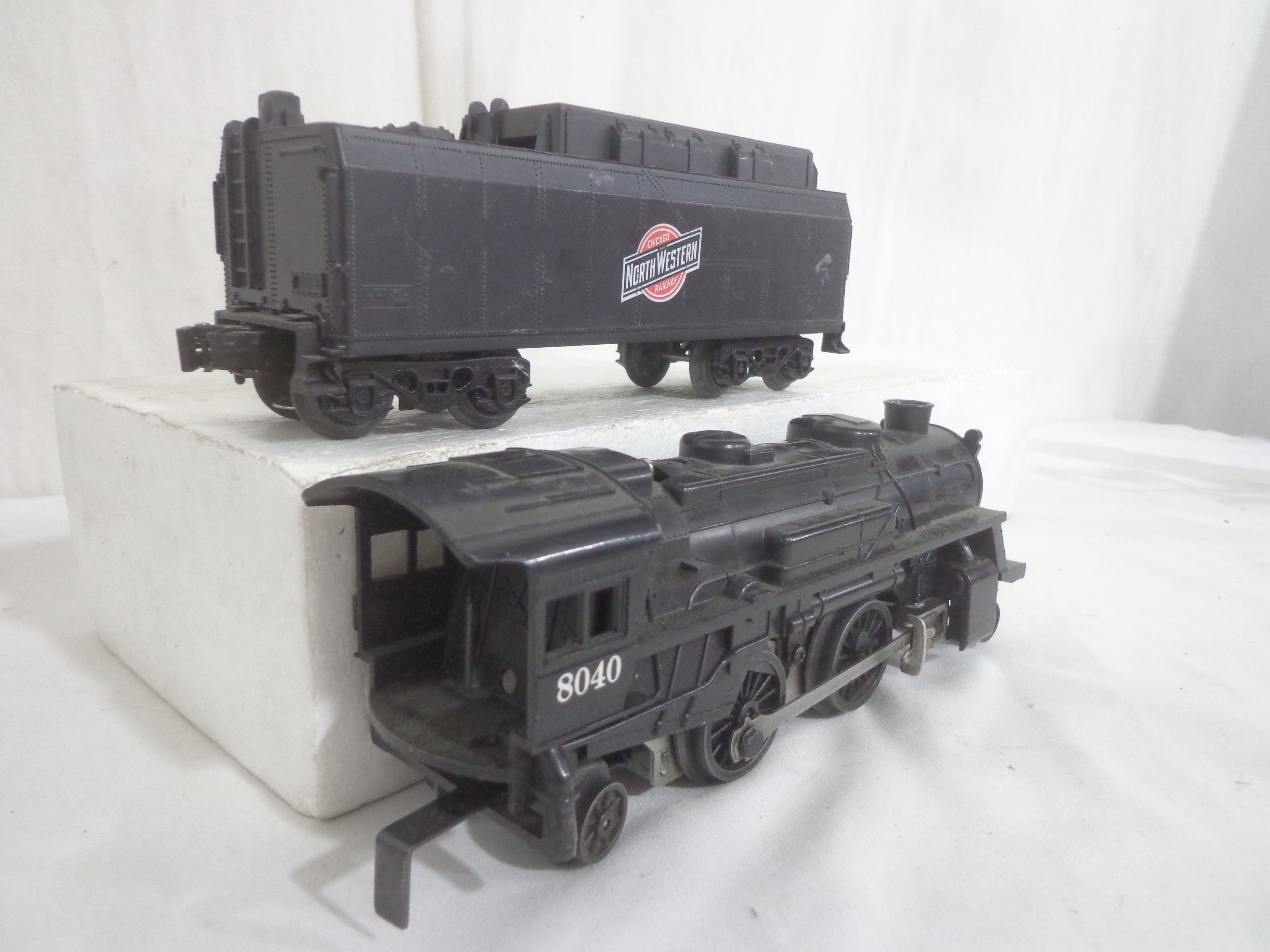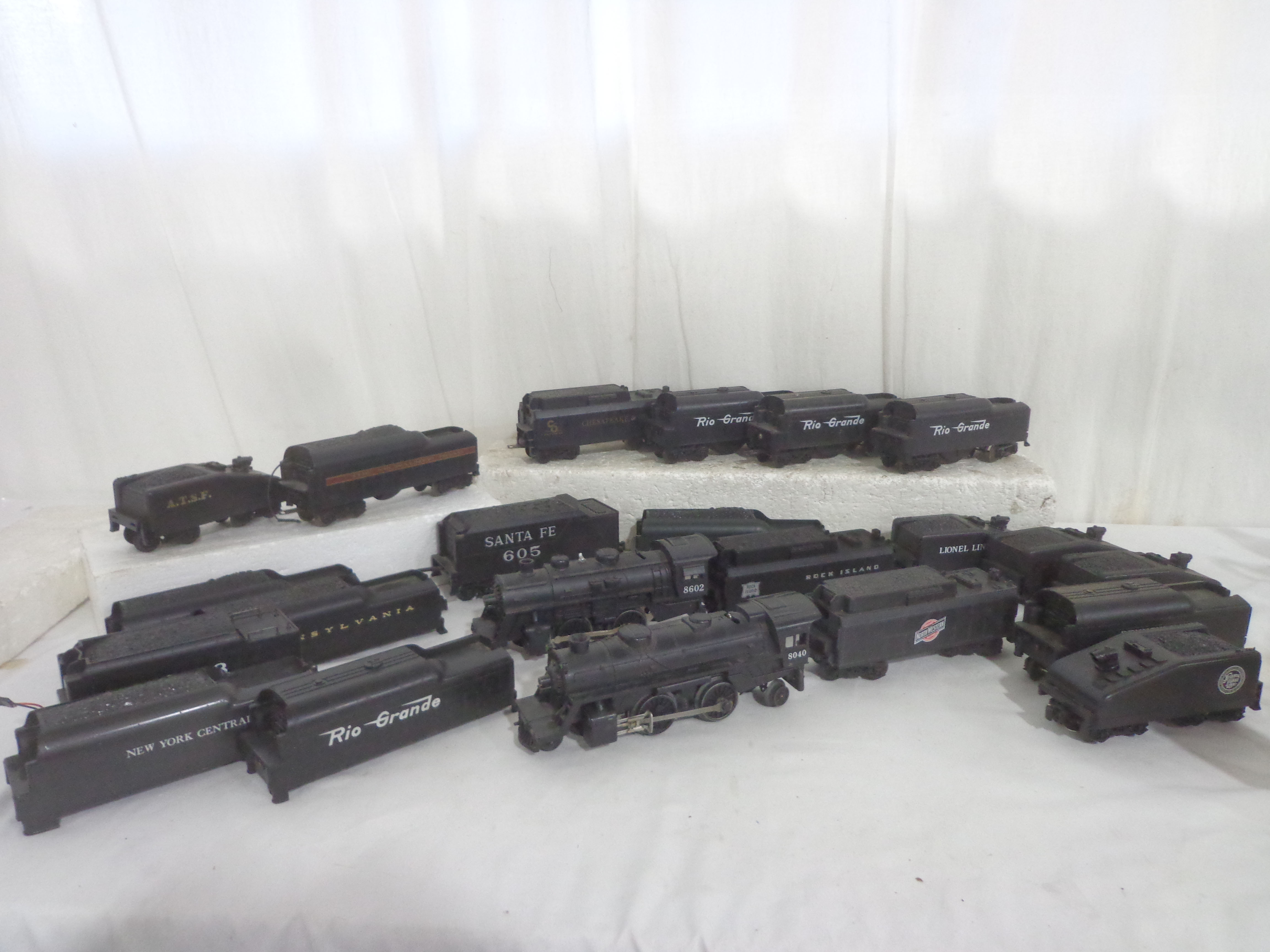 These are the #8602 Rock Island 2-4-0 Engine and Tender, the #8040 Chicago Northwestern 2-4-2 Engine and Tender, and eighteen Tenders and Tender Cabs that Lionel/Others made a few years ago. Our Opinion is that they are generally in Excellent Condition. No Boxes. Examine closely; what is pictured is what you will receive. Please add $60.00 for US-48 Shipping and Insurance (more west of the Mississippi).