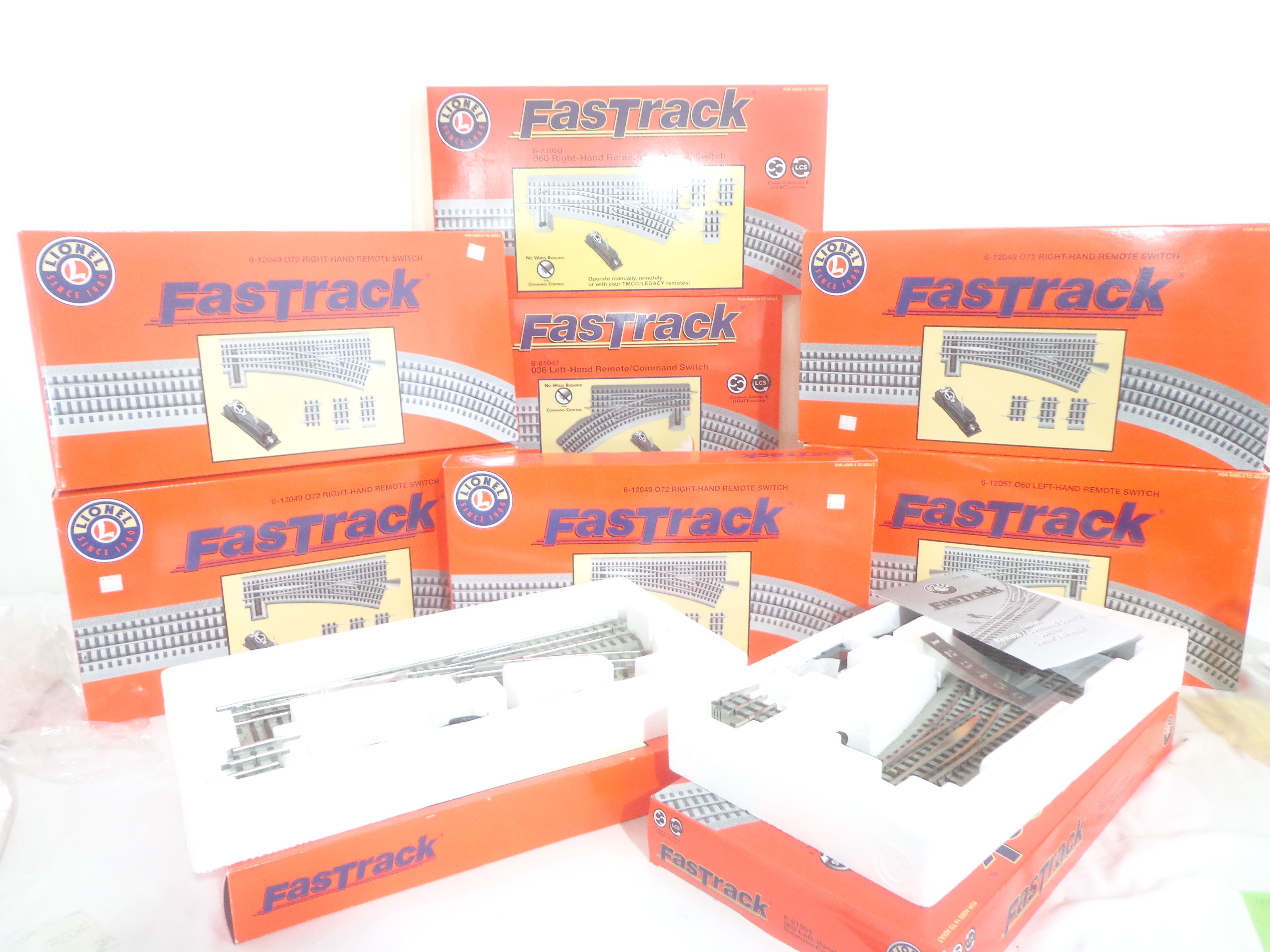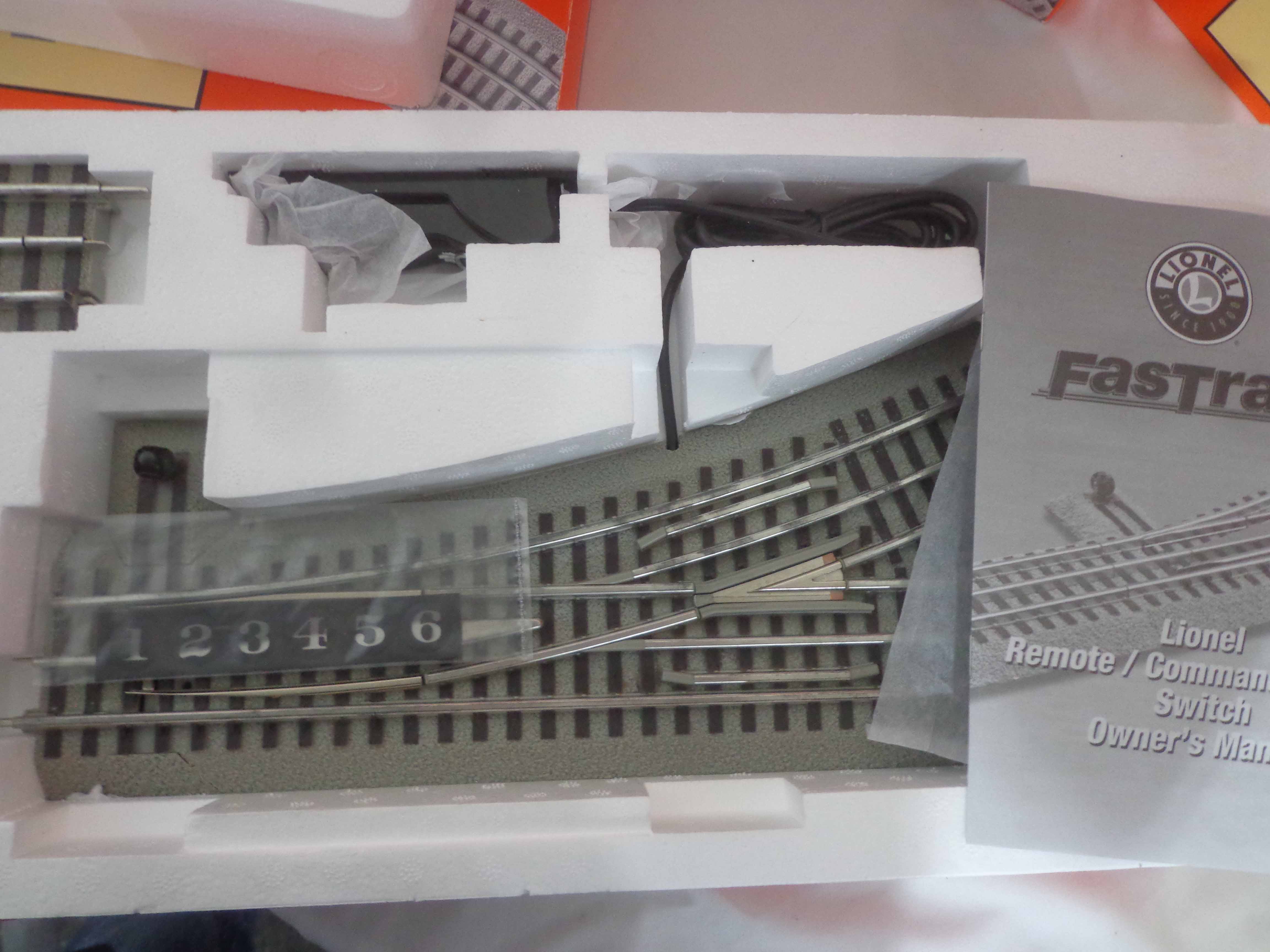 This is the nine Assorted Fastrack Control Switches that Lionel made a few years ago. Our Opinion is that it is generally in Mint Condition. Original Boxes. All Original in our Opinion. Please add $50.00 for US-48 Shipping and Insurance (more west of the Mississippi).