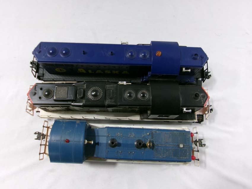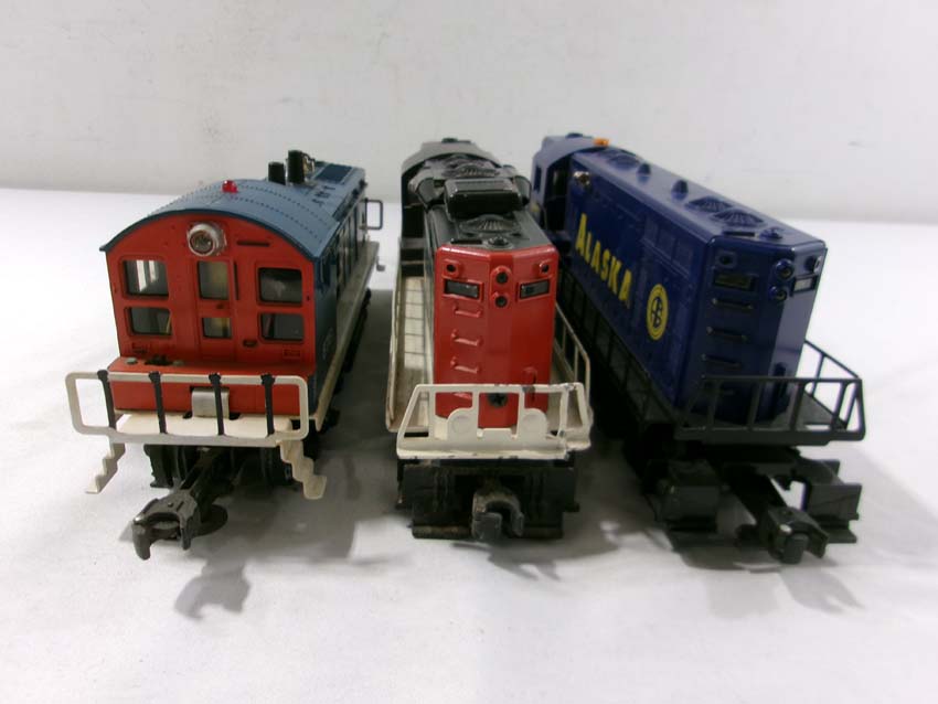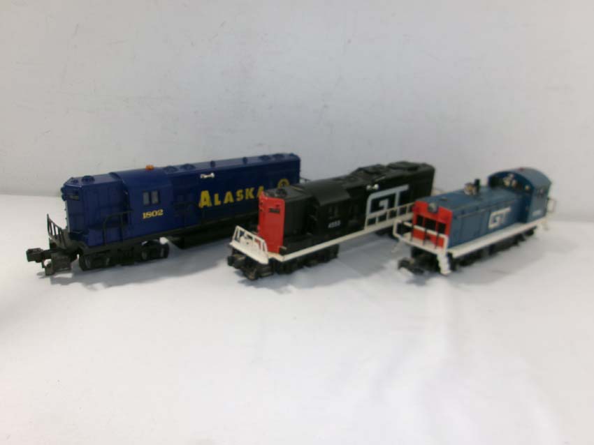 These are the #8761 GT SW Switcher Diesel Engine, the #8553 GT GP-9 Diesel Engine (postwar Chassis, no battery cover), and the #1802 Alaska RR GP-7 Diesel Engine that Lionel made a few years ago Our Opinion is that they are generally in Excellent Condition. No Boxes. Examine closely; wht at is pictured is what you will receive. Please add $50.00 for US-48 Shipping and Insurance (more west of the Mississippi).
