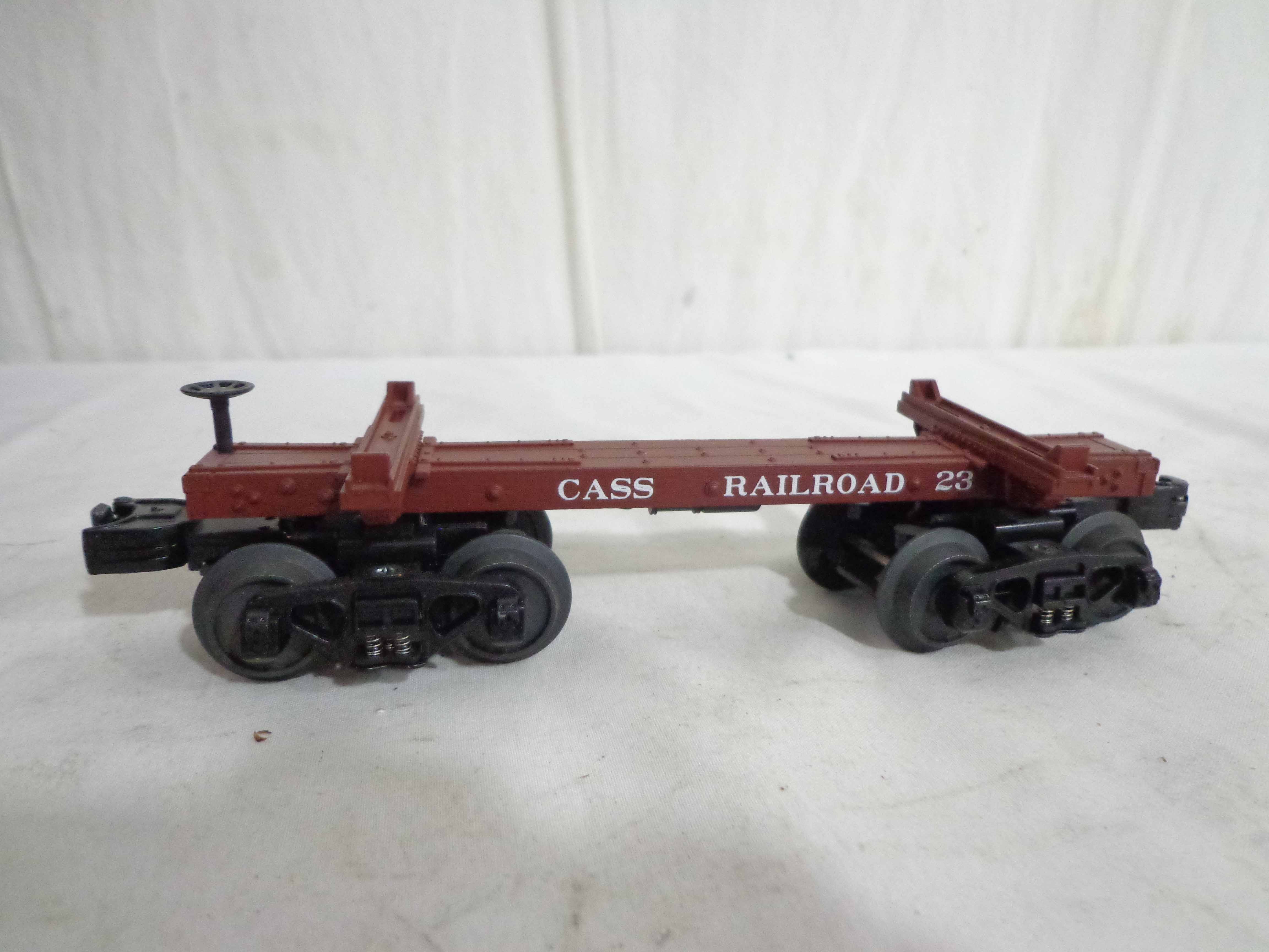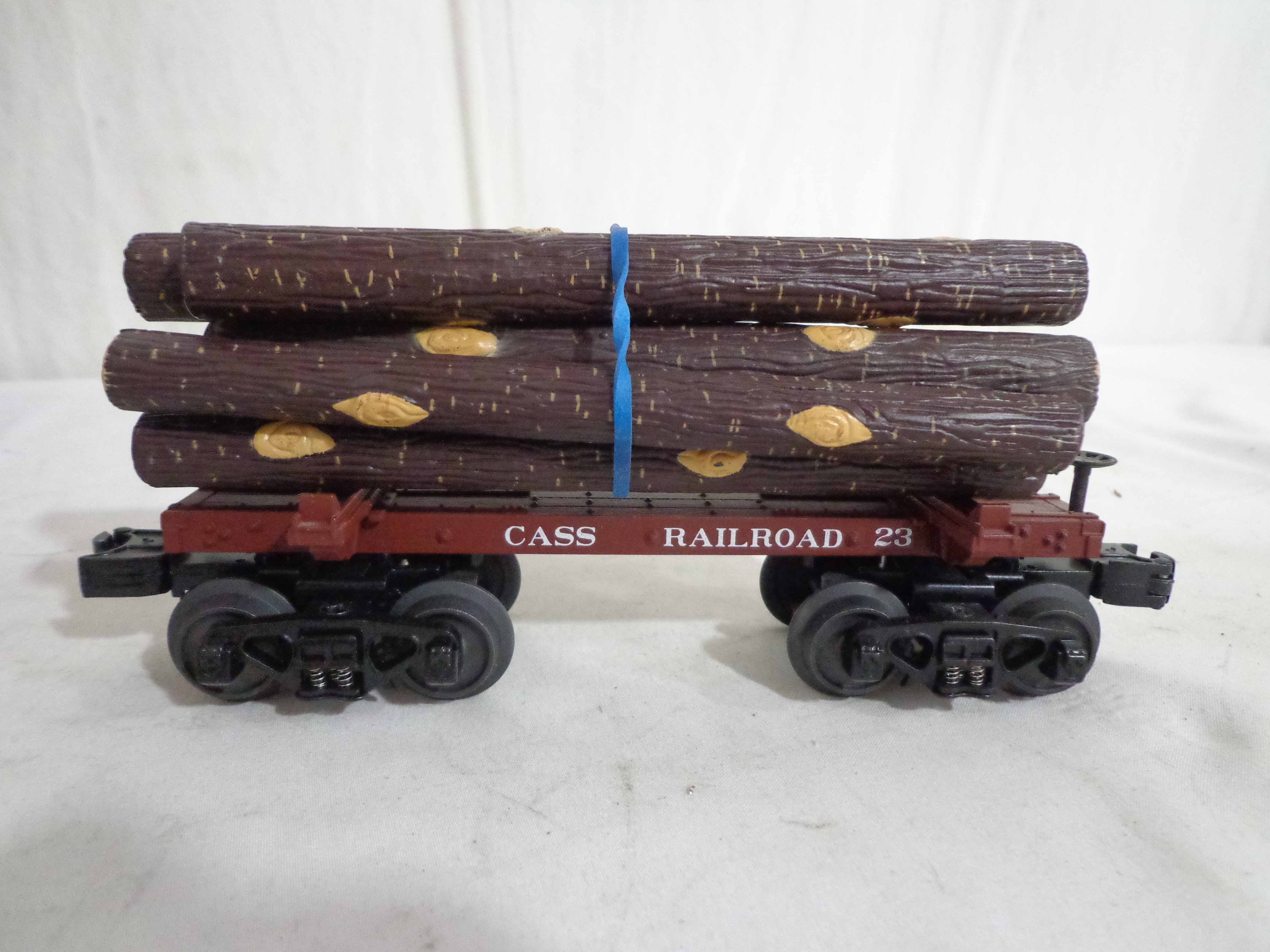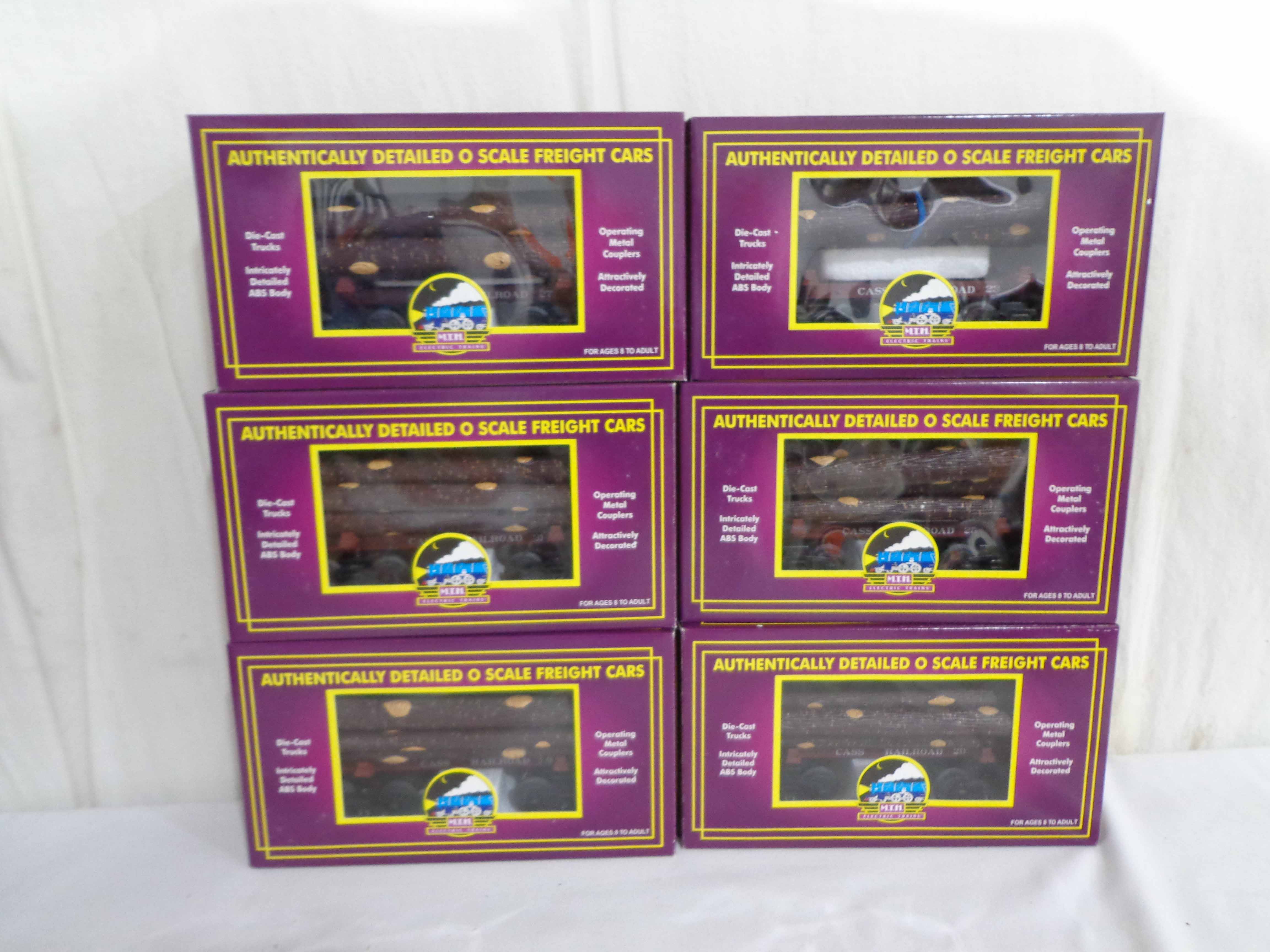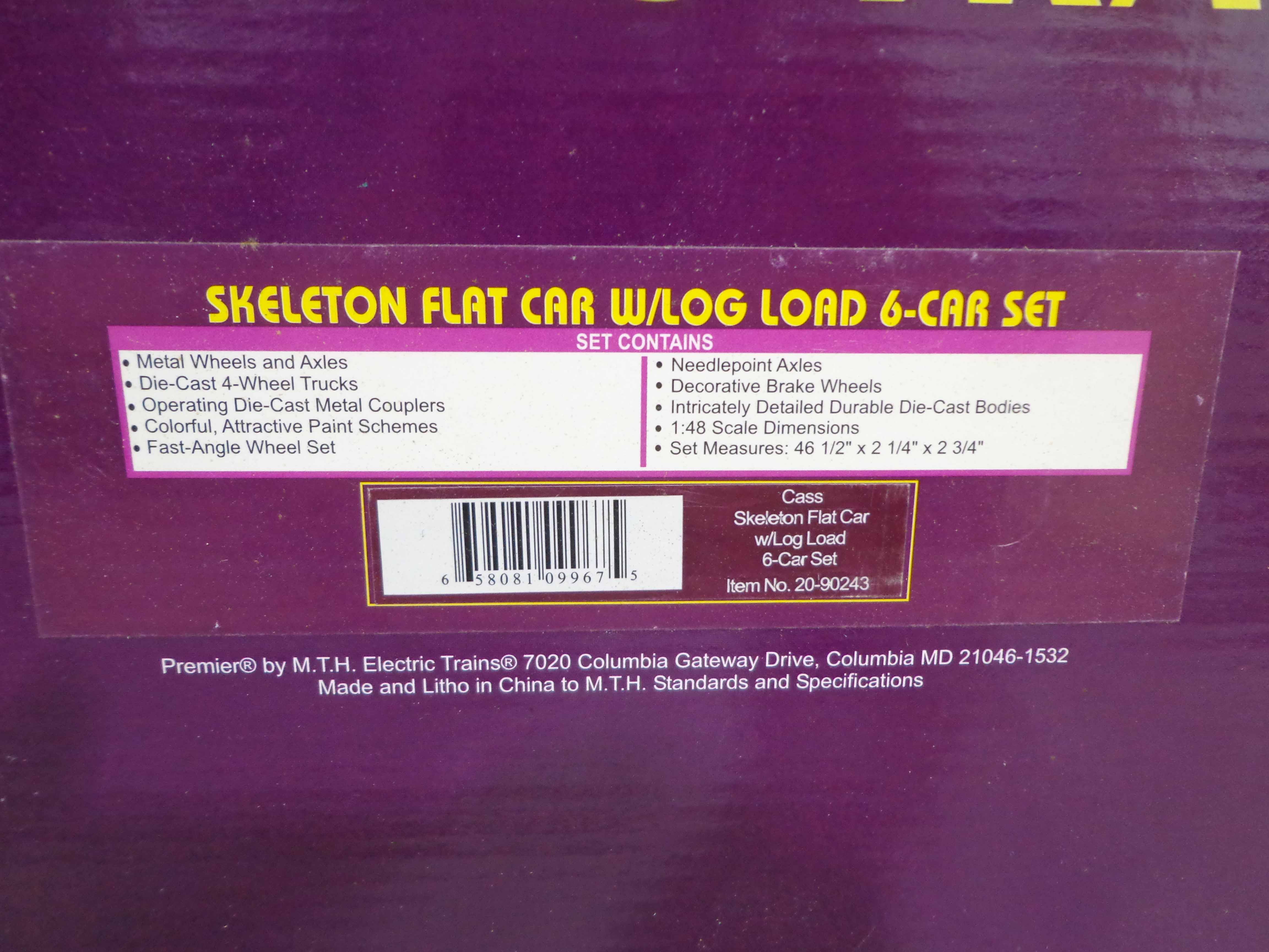 This is the #20-90243 Cass Skeleton Flat Cars with Logs Set of 6 that MTH made in O Gauge a few years ago. Our Opinion is that the Set is generally in Mint Condition. Original Boxes. All Original in our Opinion. Please add $45.00 for US-48 Shipping and Insurance (more west of the Mississippi).
