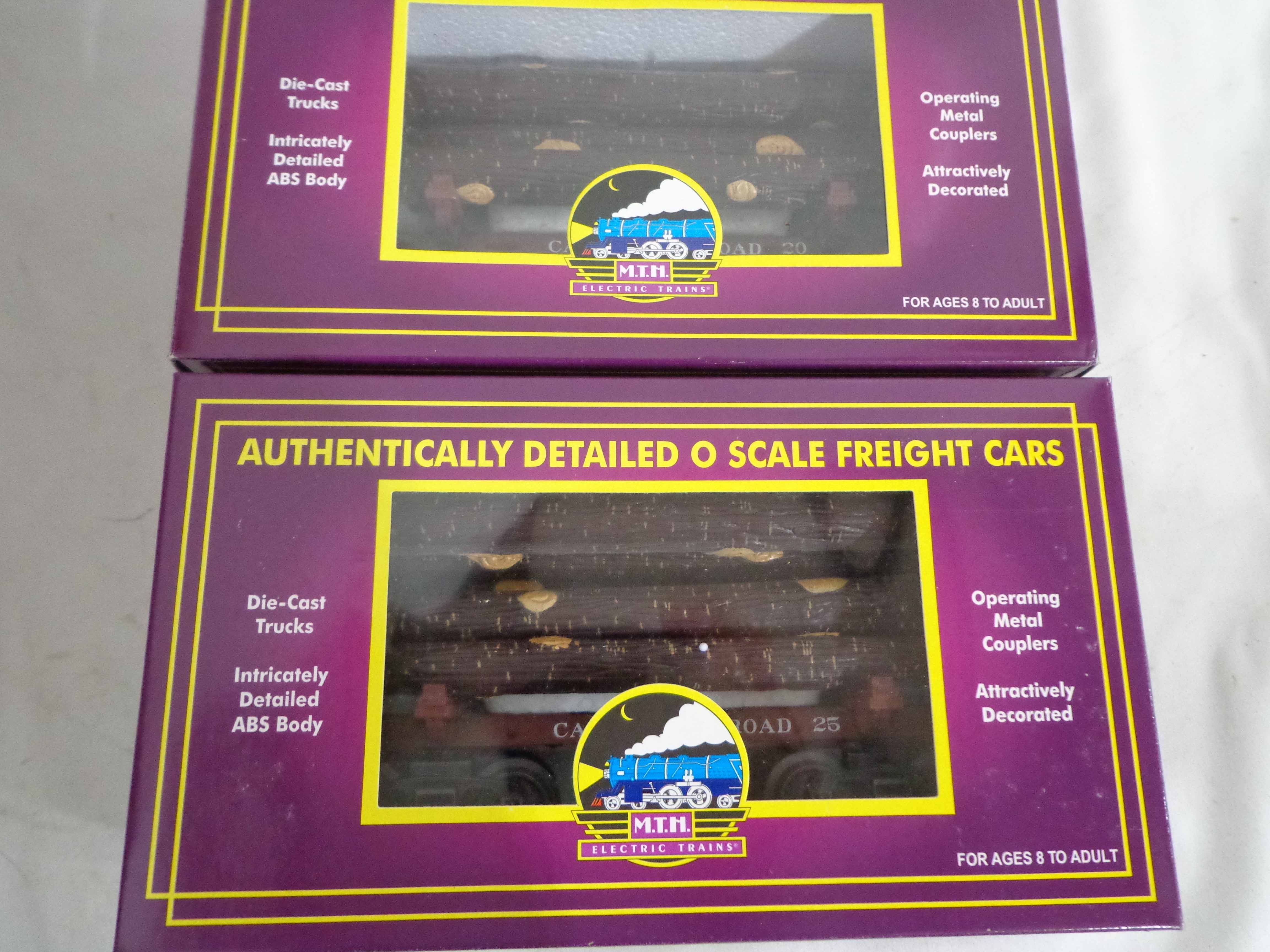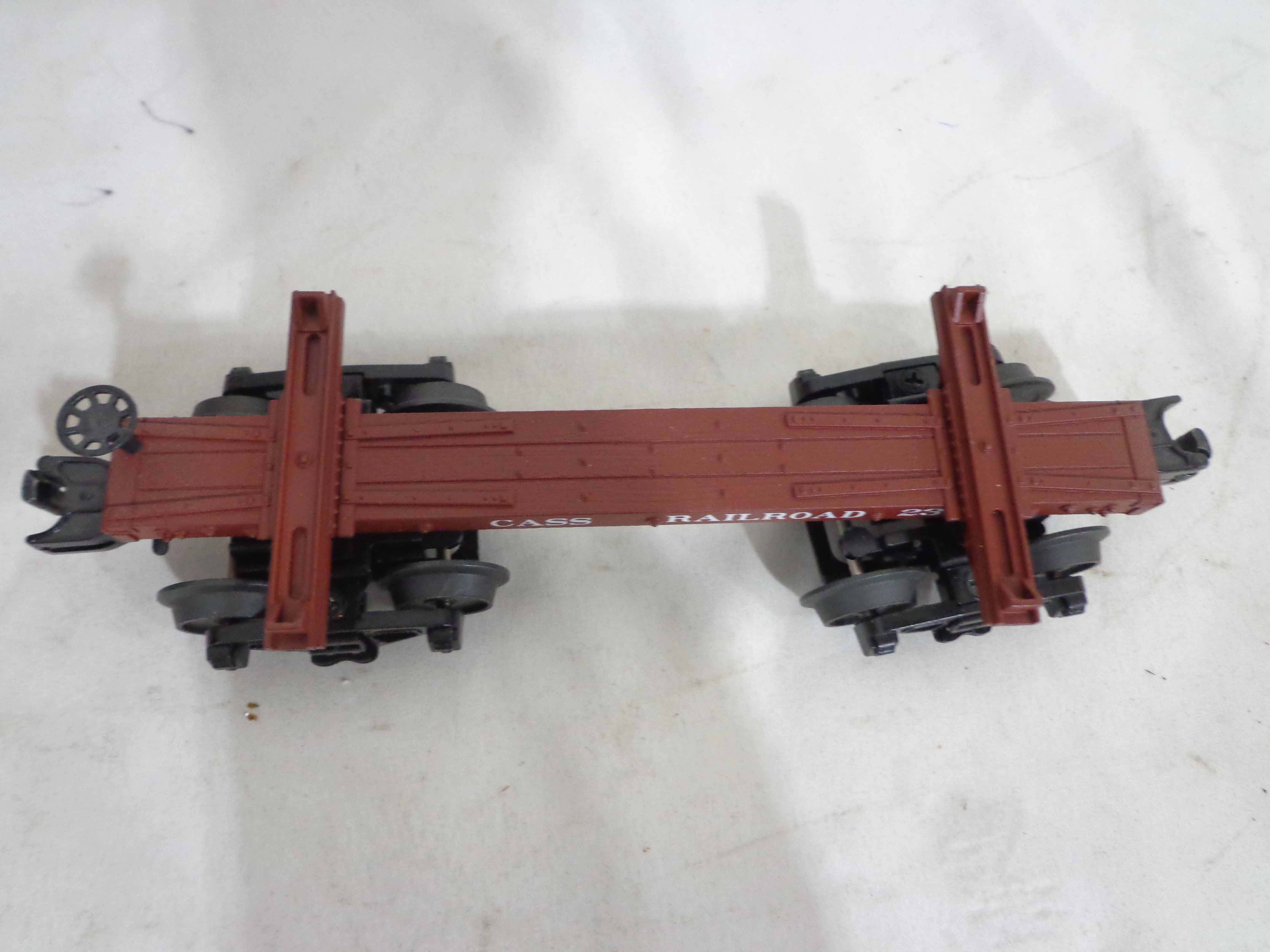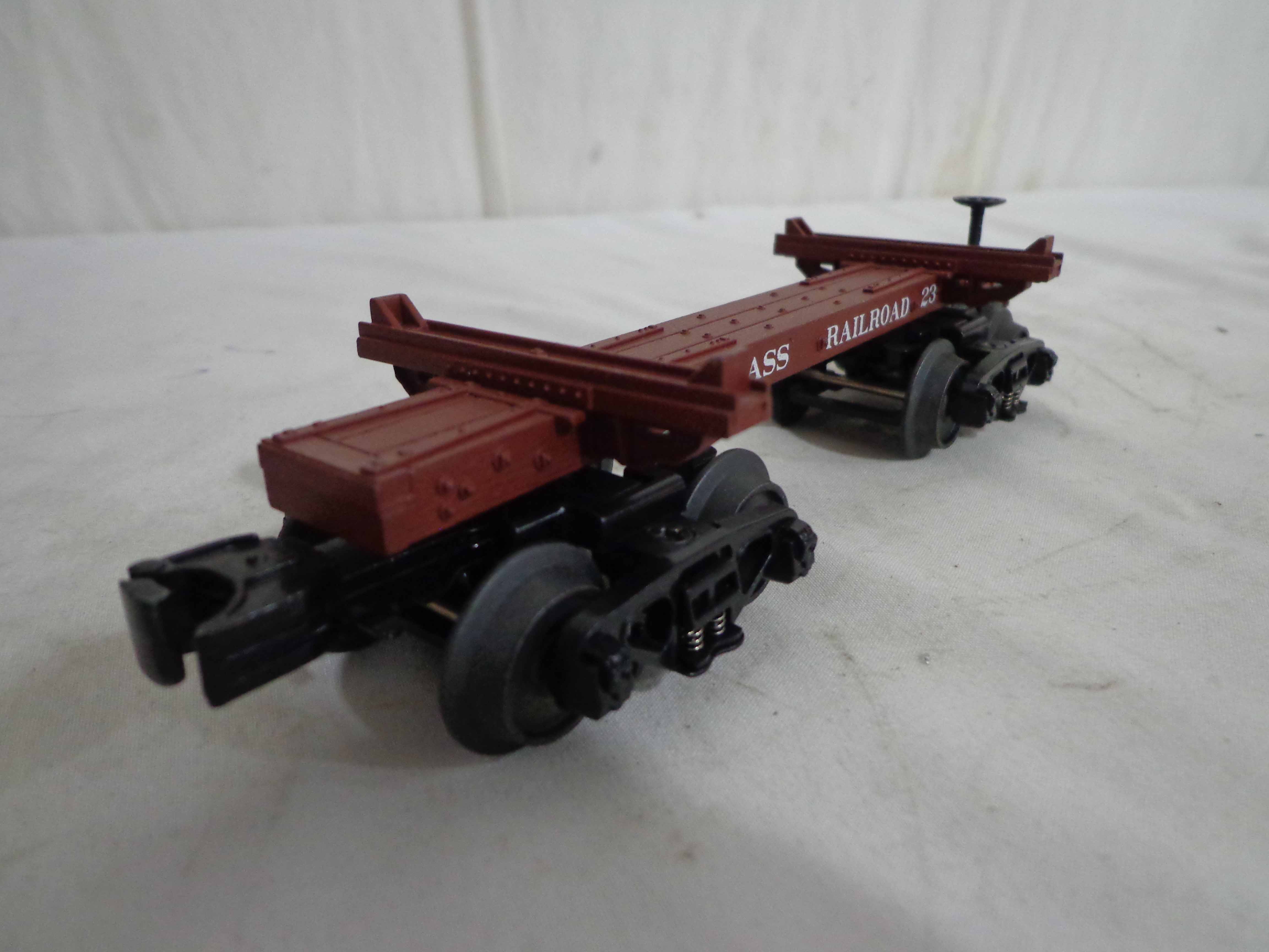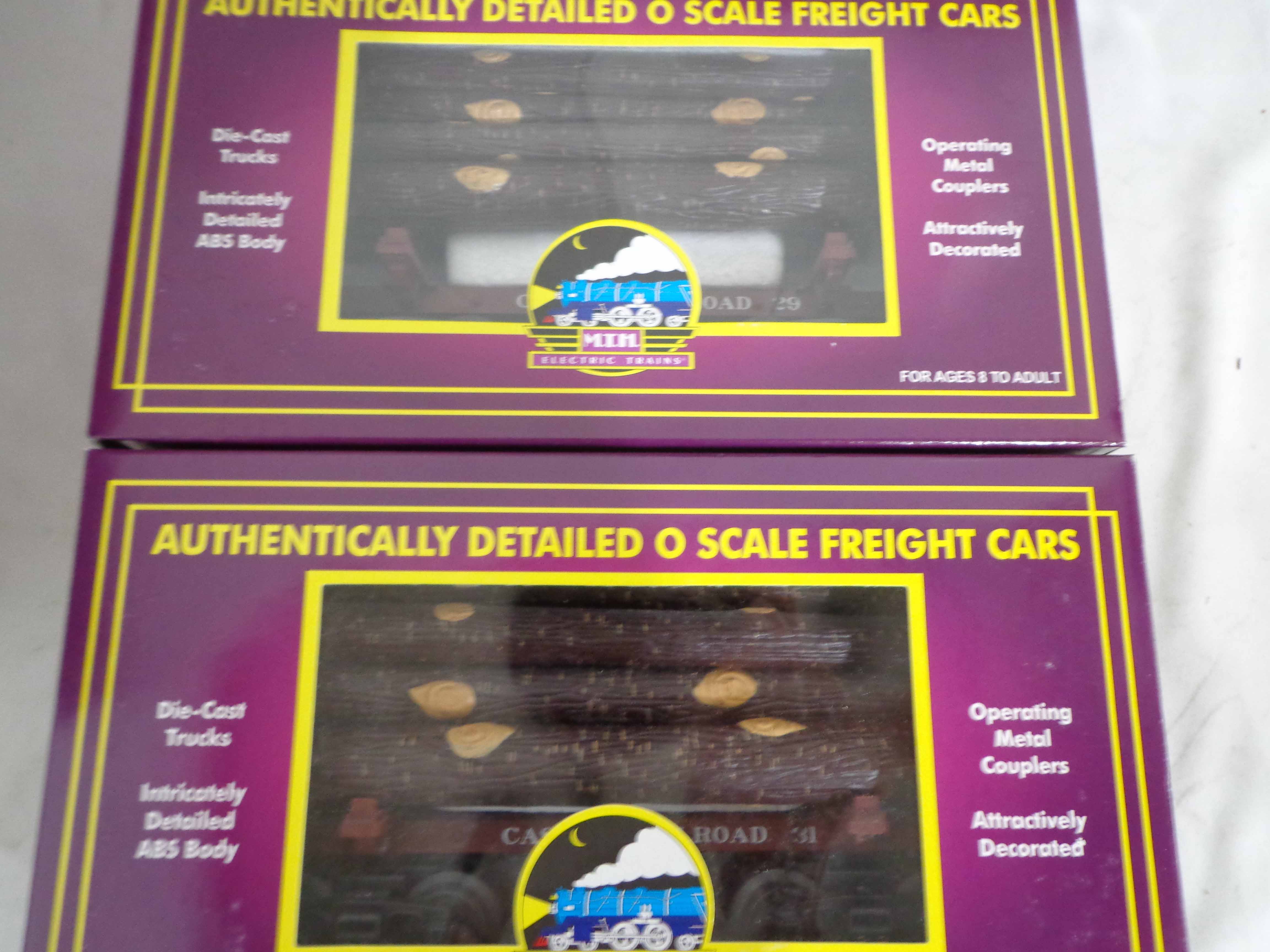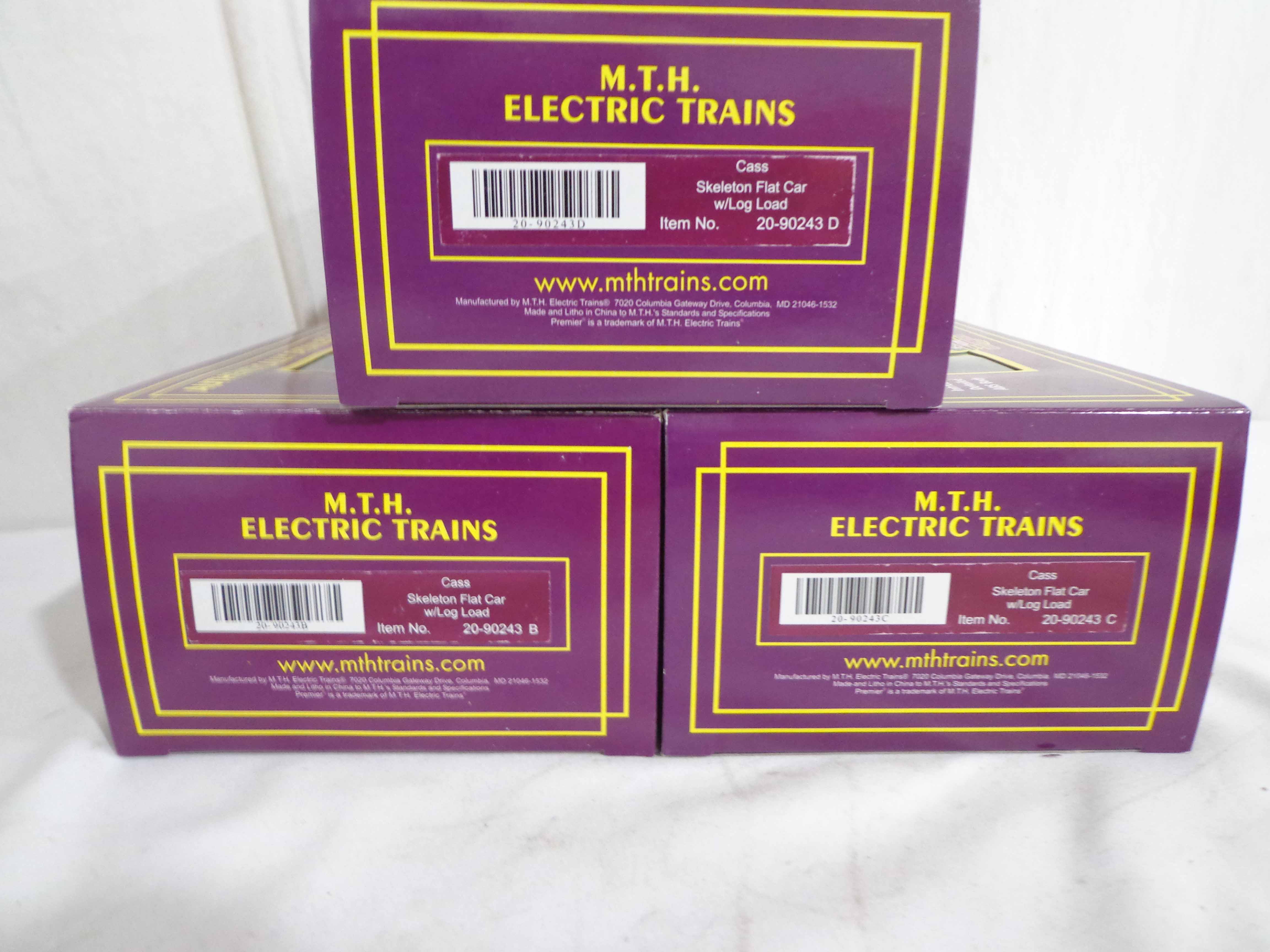 This is the #20-90243 Cass Skeleton Flat Cars with Logs Set of 6 that MTH made in O Gauge a few years ago. Our Opinion is that the Set is generally in Mint Condition. Original Boxes. All Original in our Opinion. Please add $45.00 for US-48 Shipping and Insurance (more west of the Mississippi).