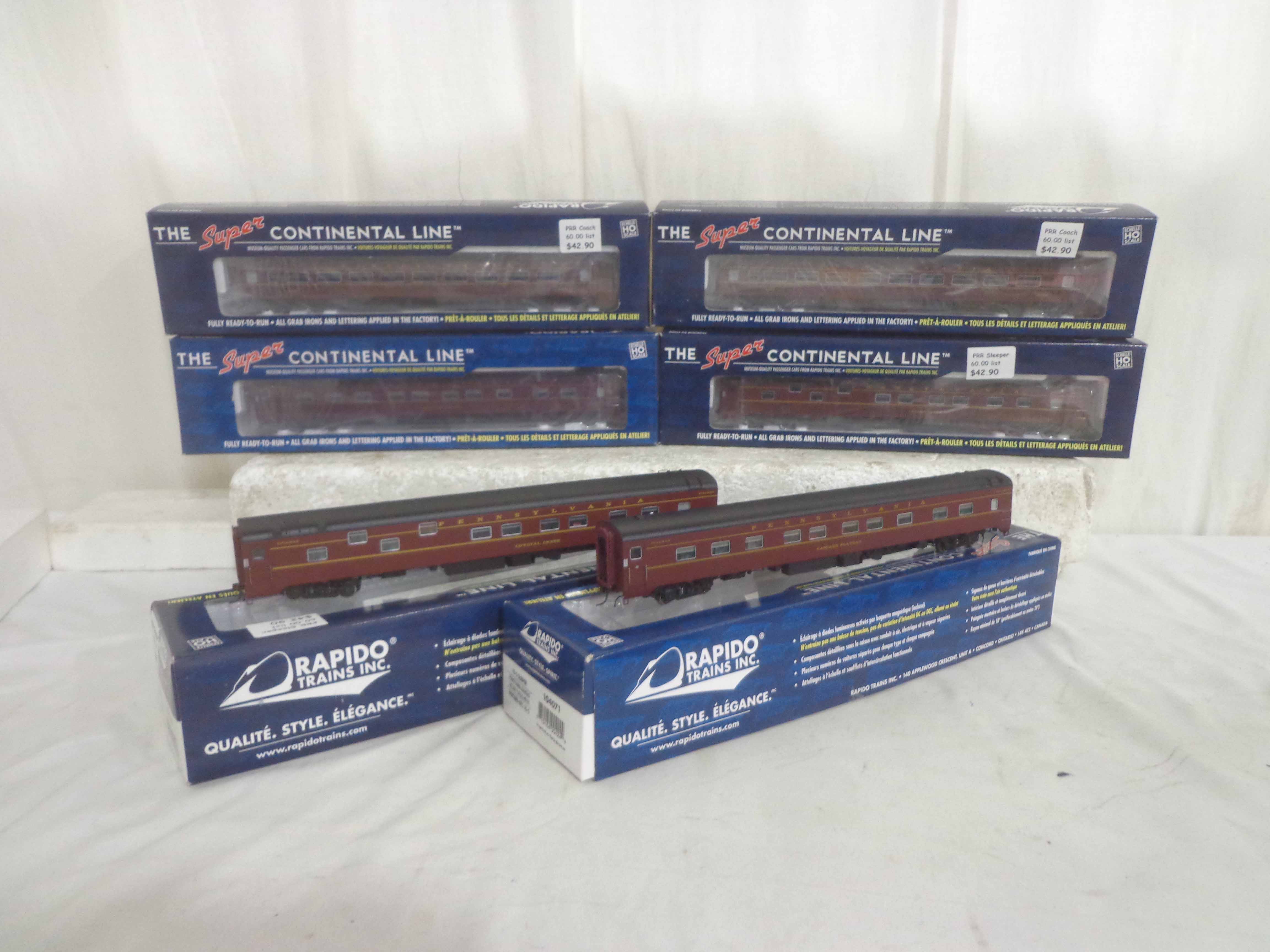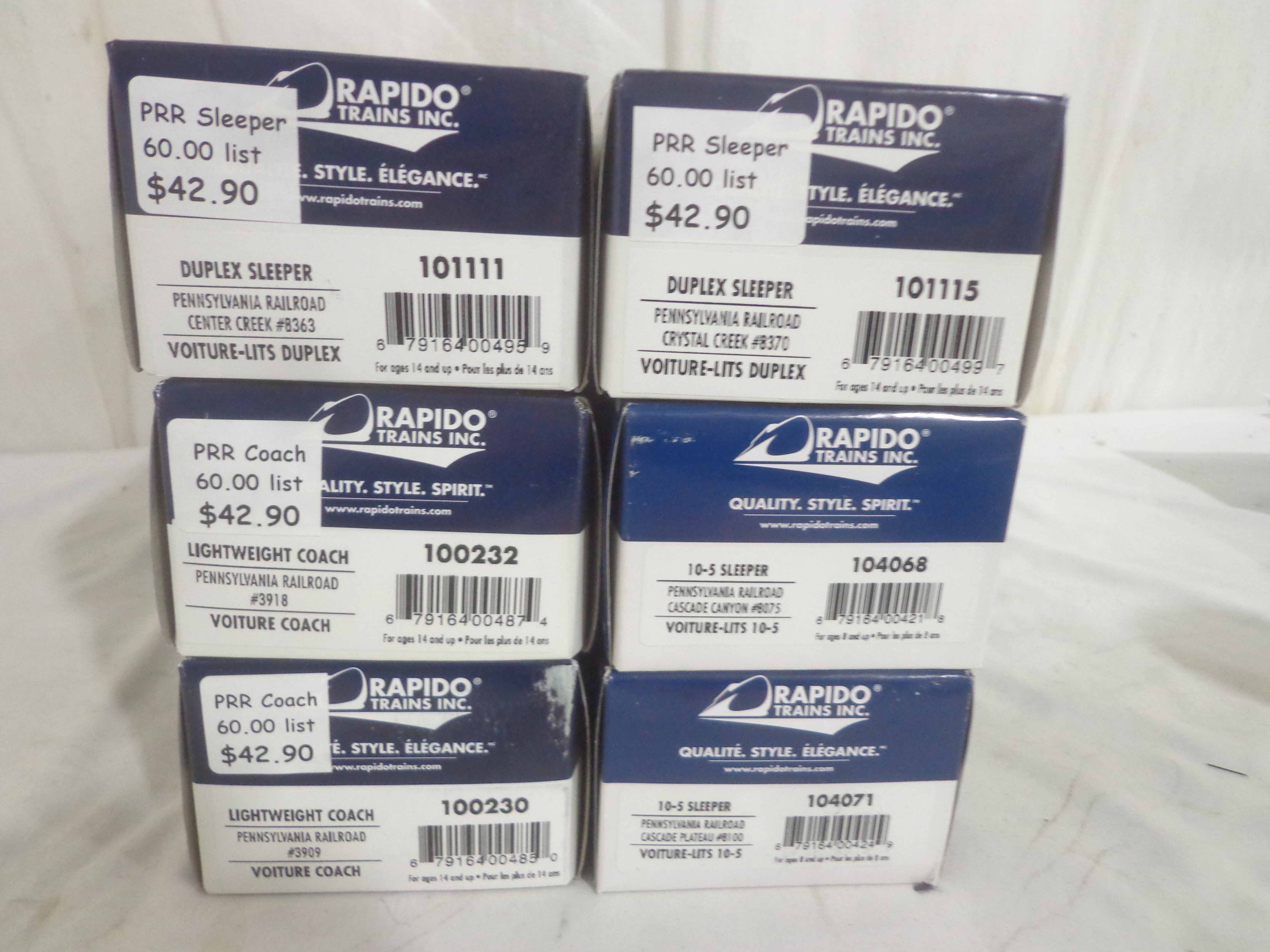 These are the Rapido Trains HO Gauge #101111/101115/100232/104068/104071 Pennsylvania Passenger Cars. Original Boxes. Examine closely; what is pictured is what you will receive. Please add $45.00 for US-48 Shipping and Insurance (more west of the Mississippi).