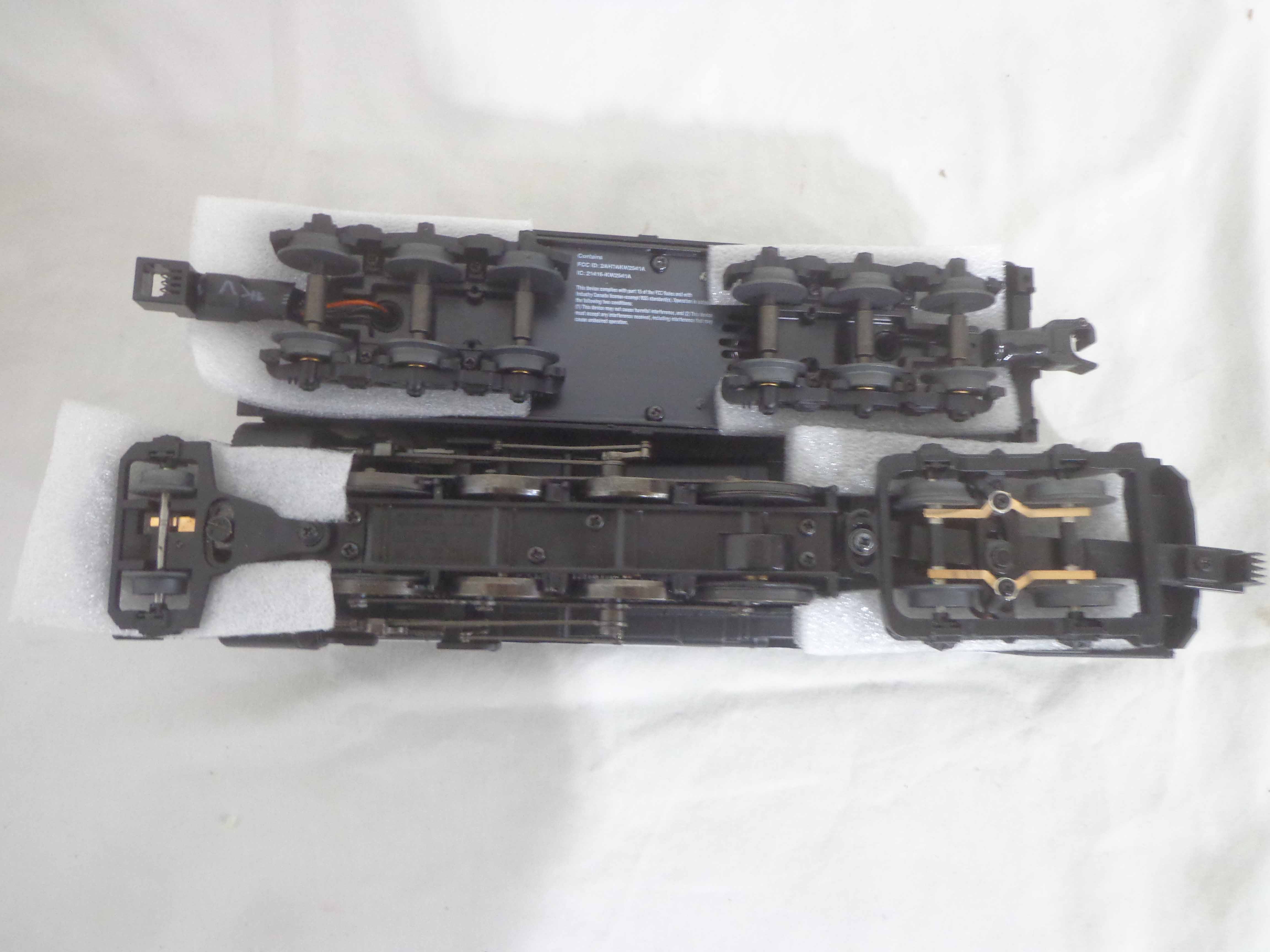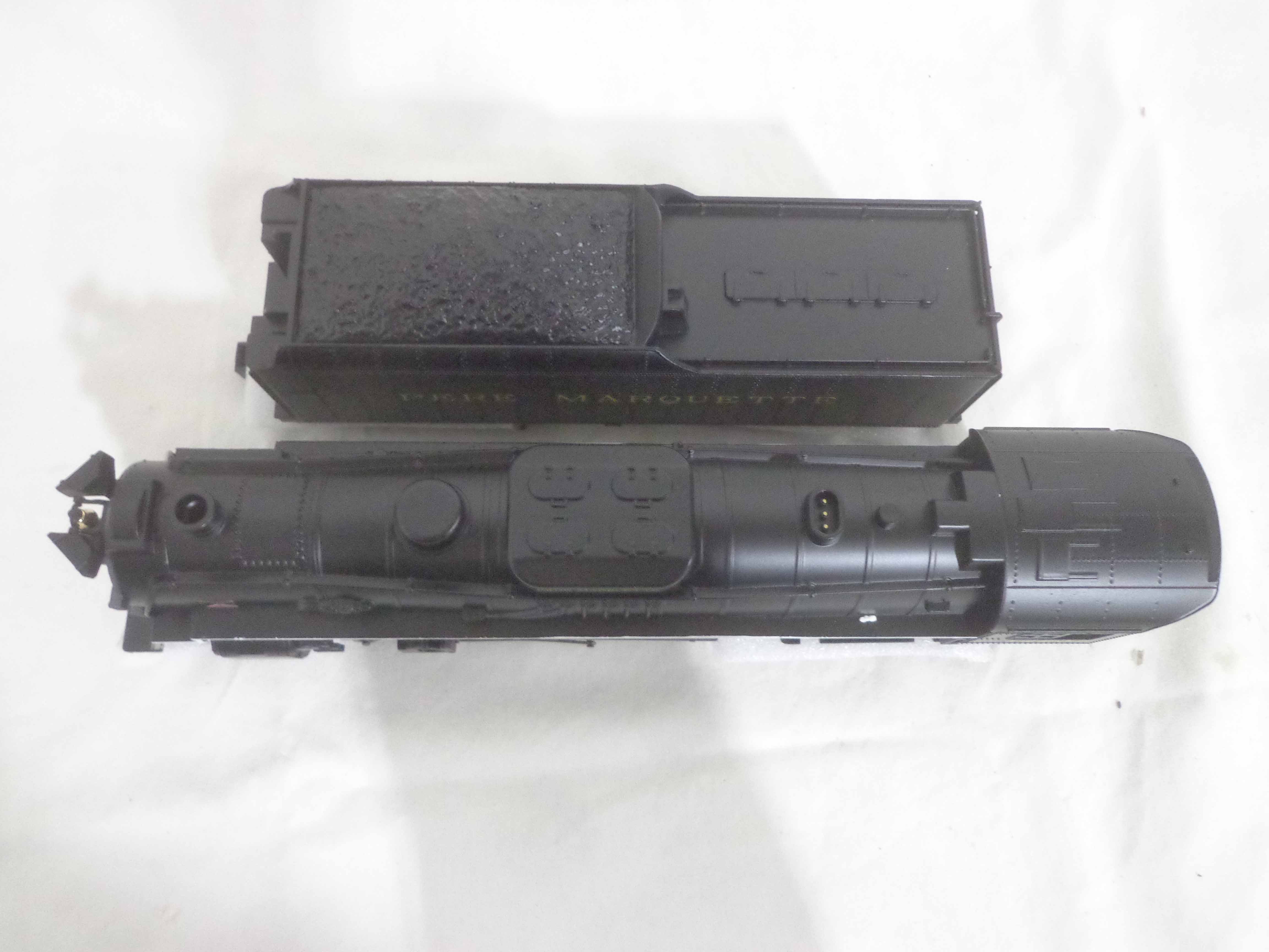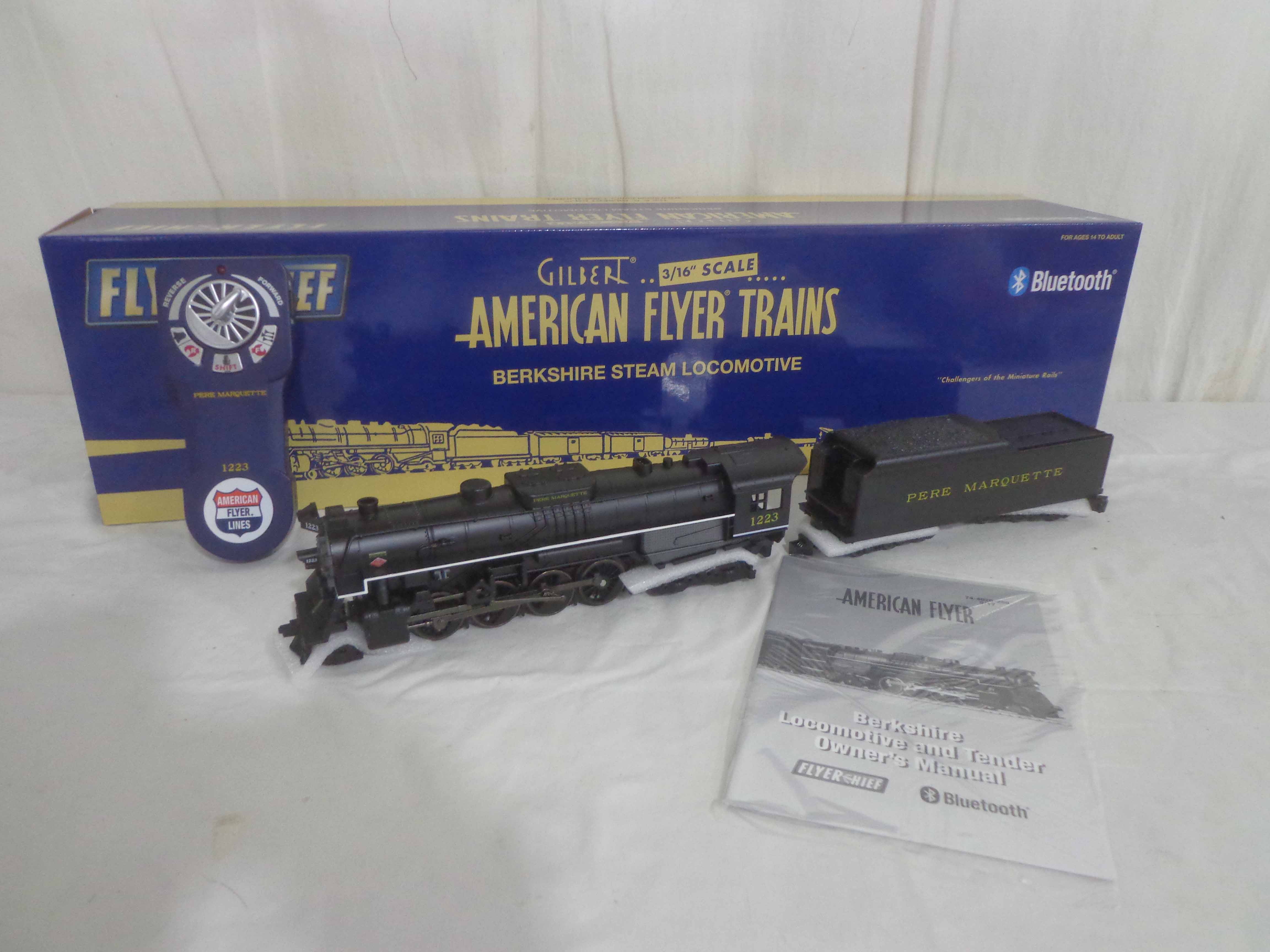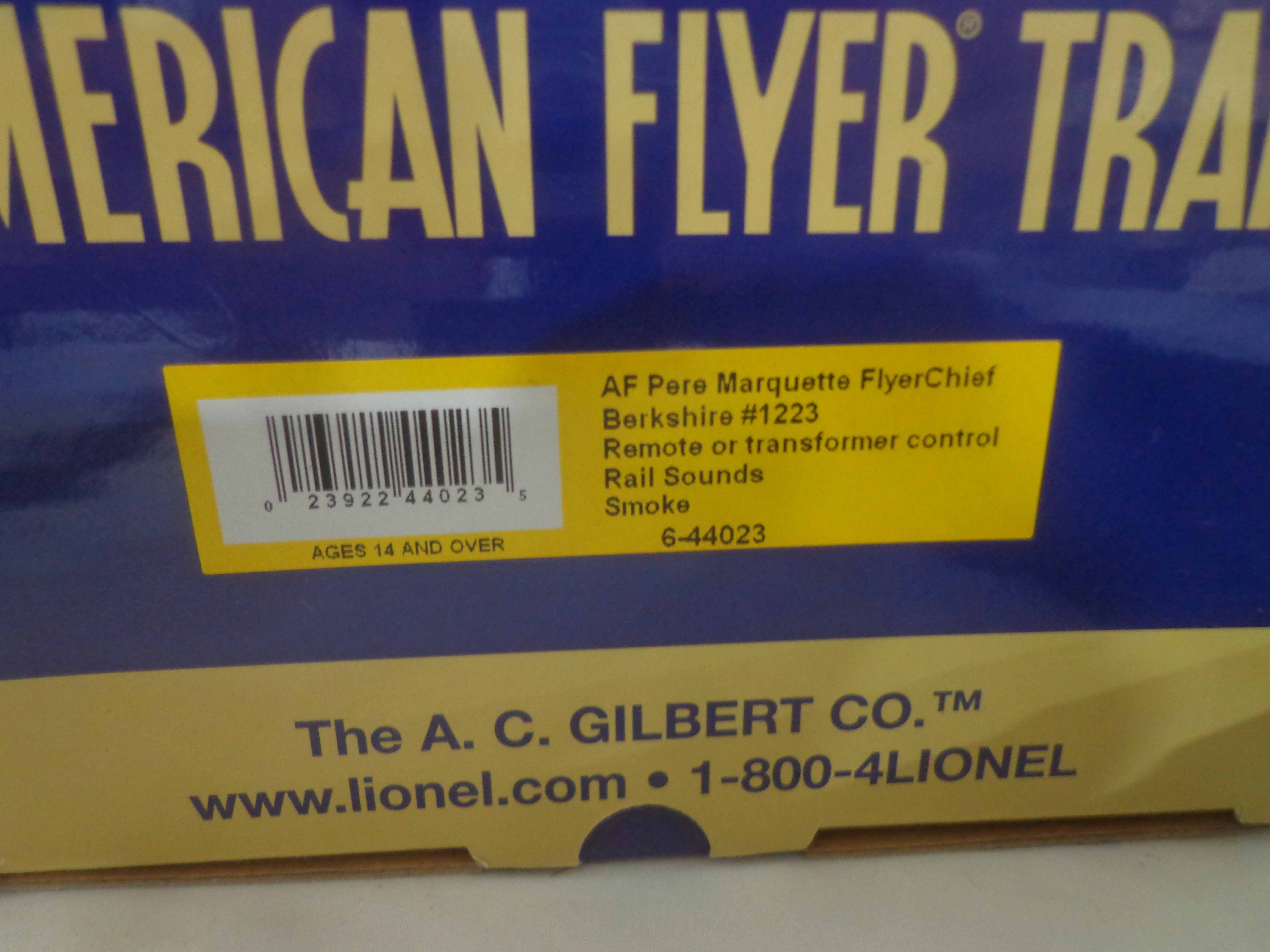 These are the #44023 Pere Marquette Flyer Chief 2-8-4 Engine and Tender (with Bluetooth Command, Fan-Driven Smoke, Speed Control, Electrocoupler, and Railsounds) that Lionel made several years ago in their American Flyer S Gauge line. Original Box. Our Opinion is that they are generally in Like New Condition. All Original in our Opinion. Please add $40.00 for US-48 Shipping and Insurance (more west of the Mississippi).