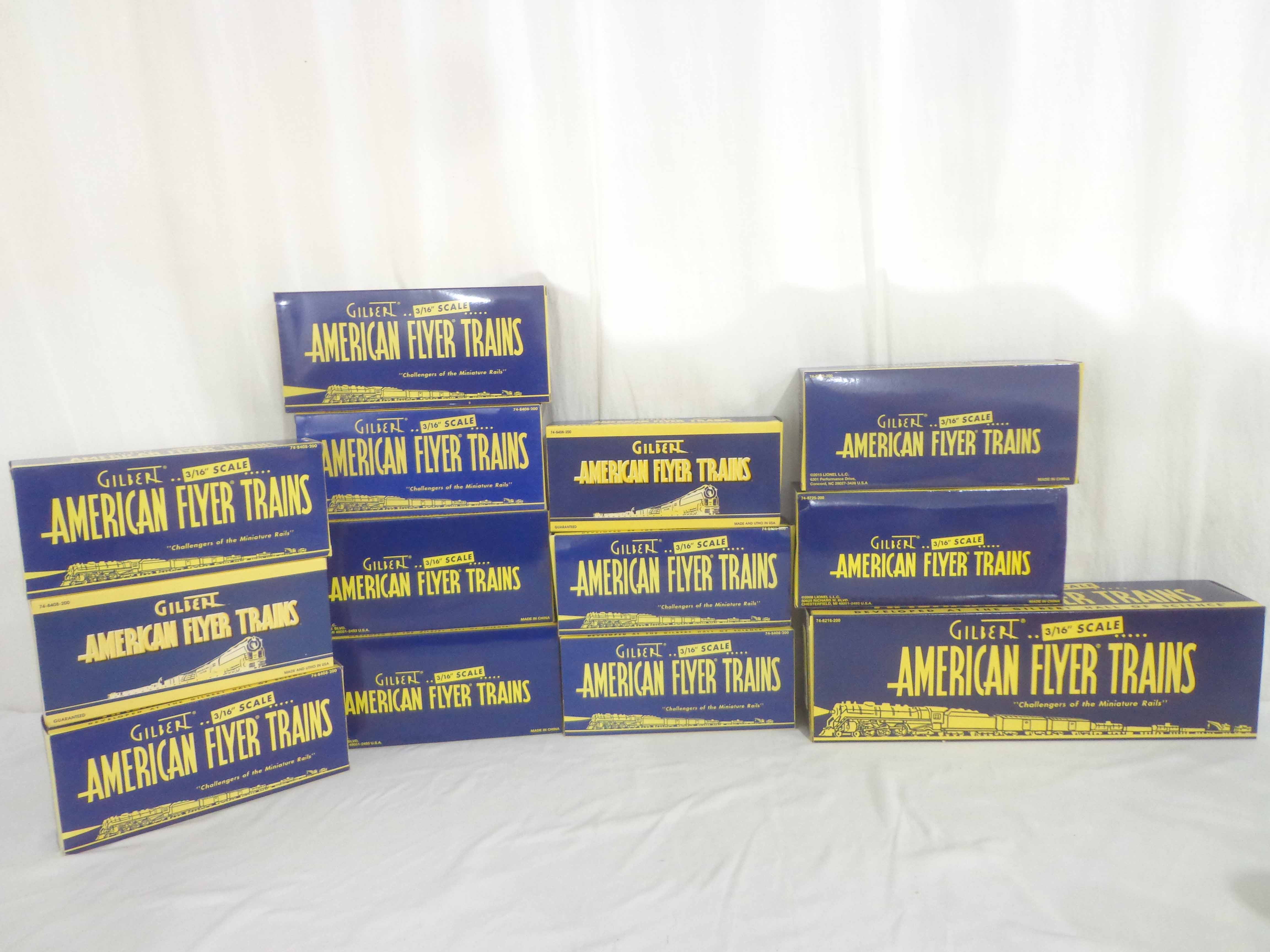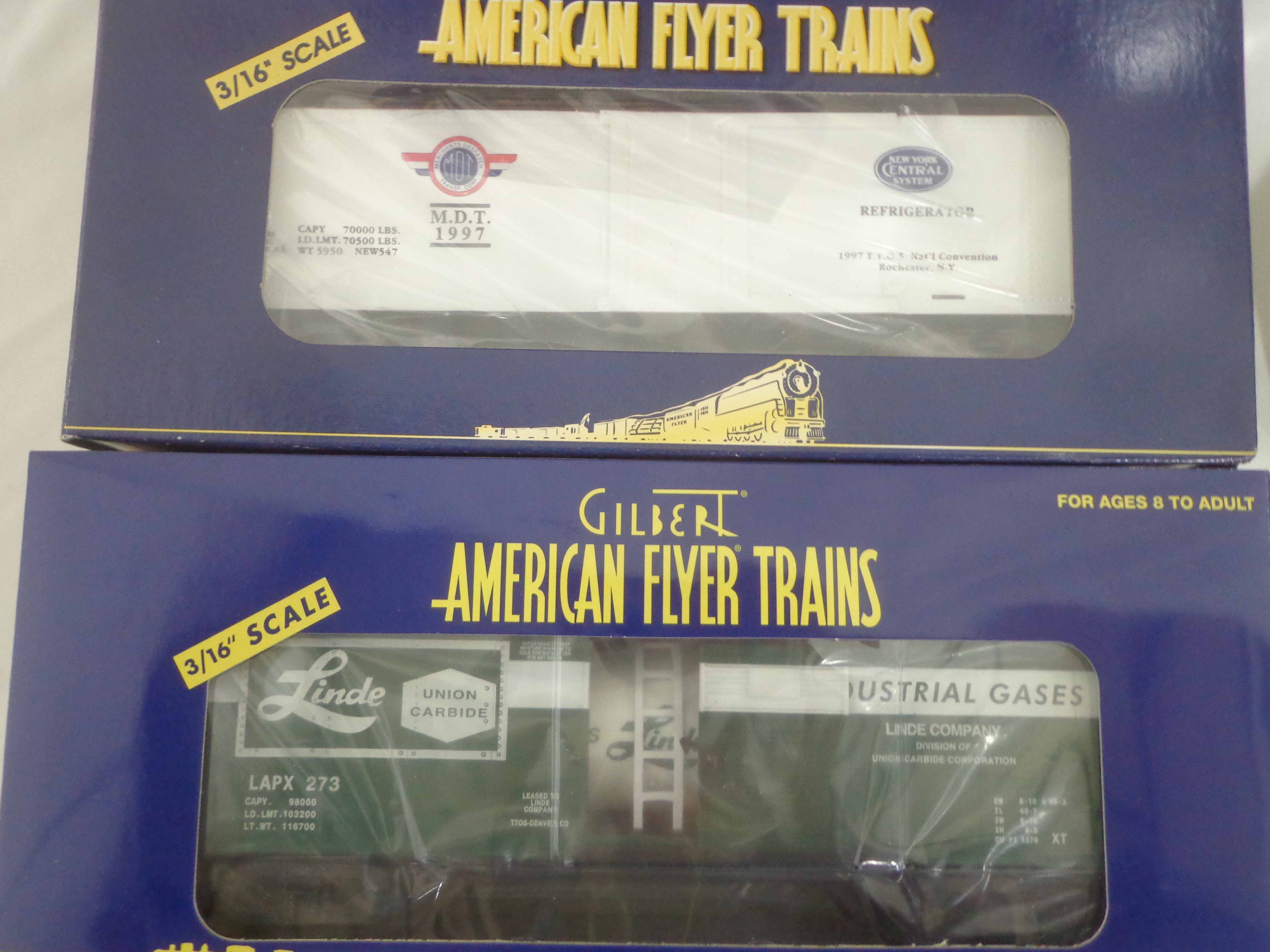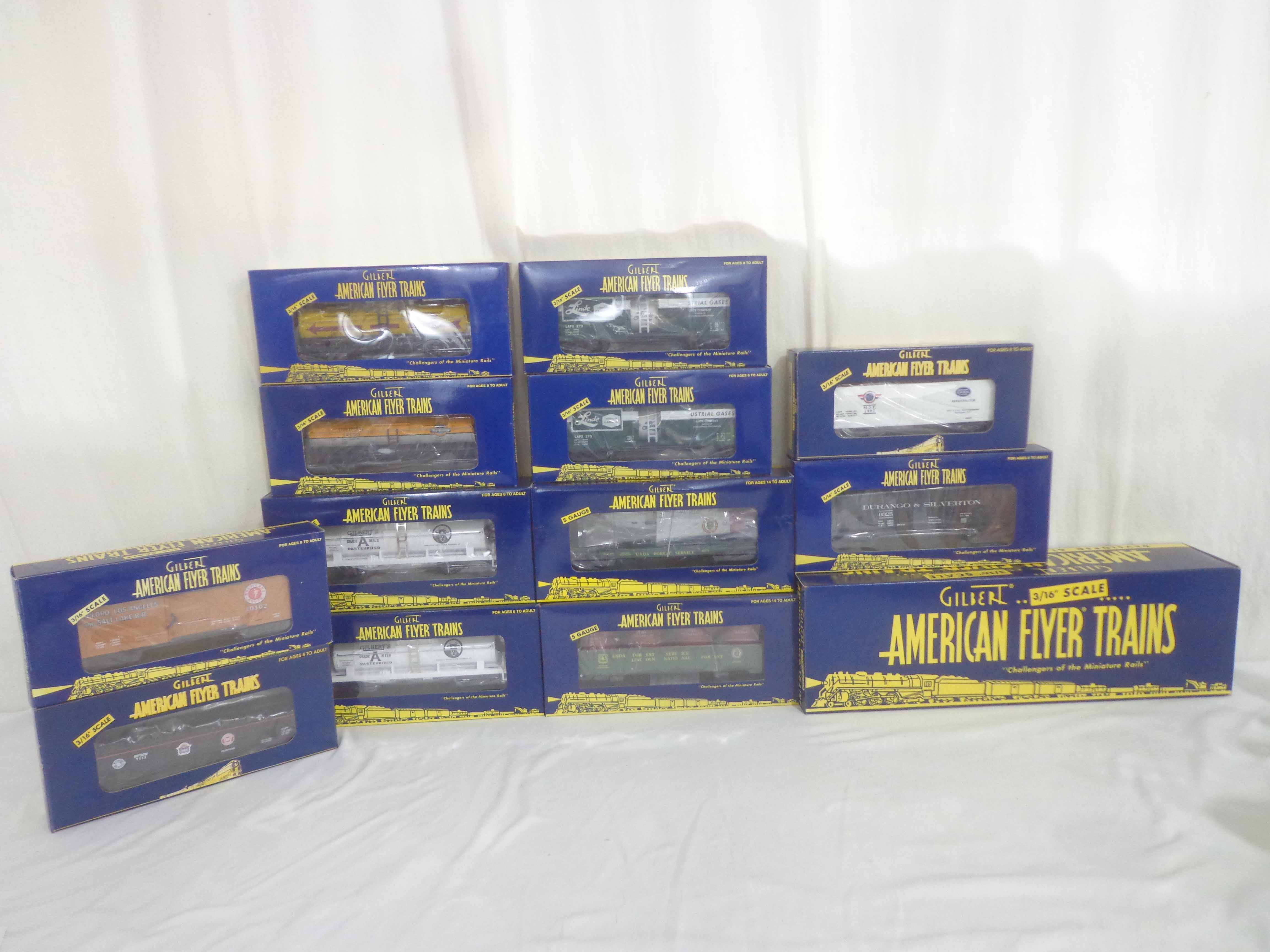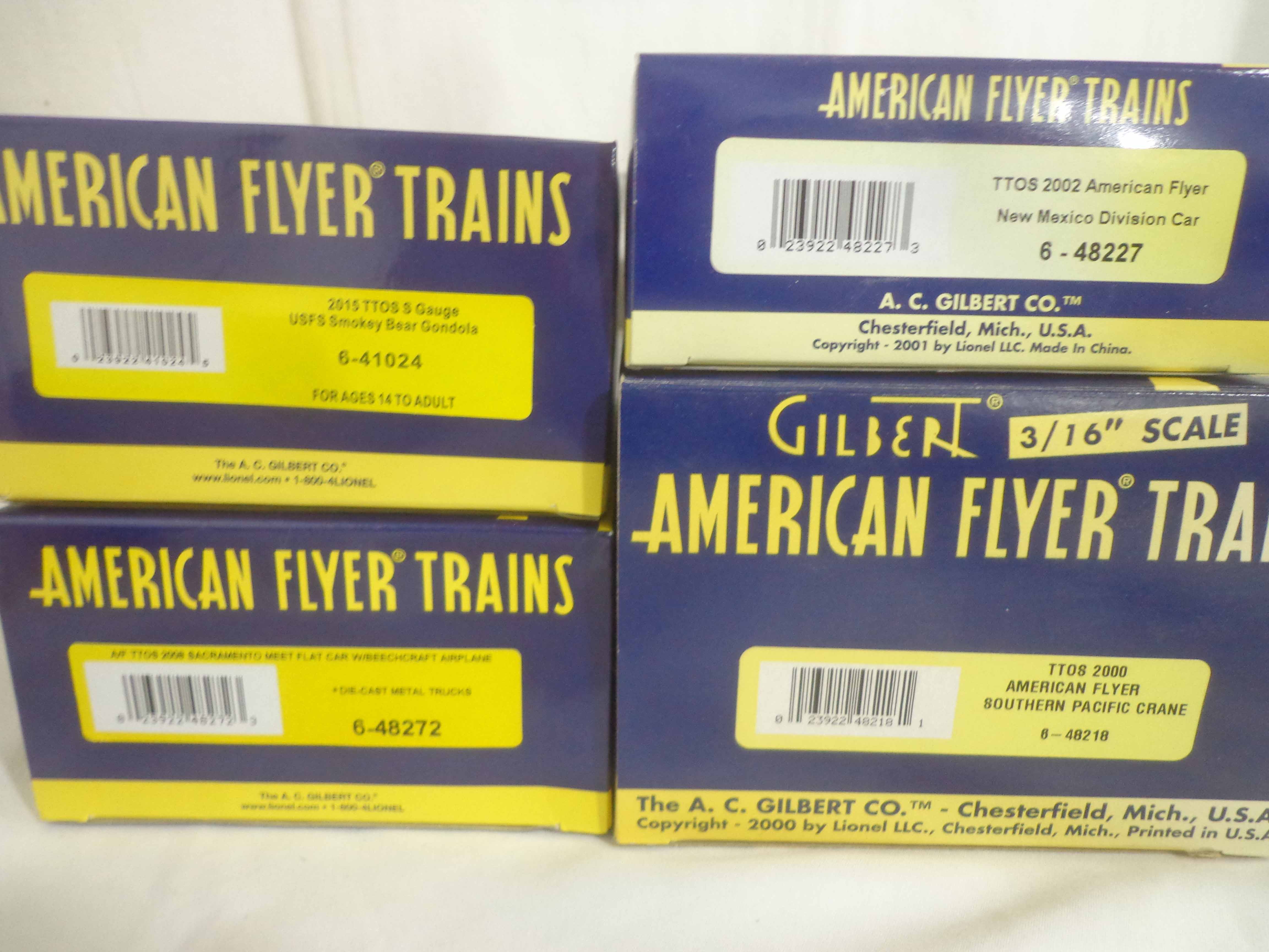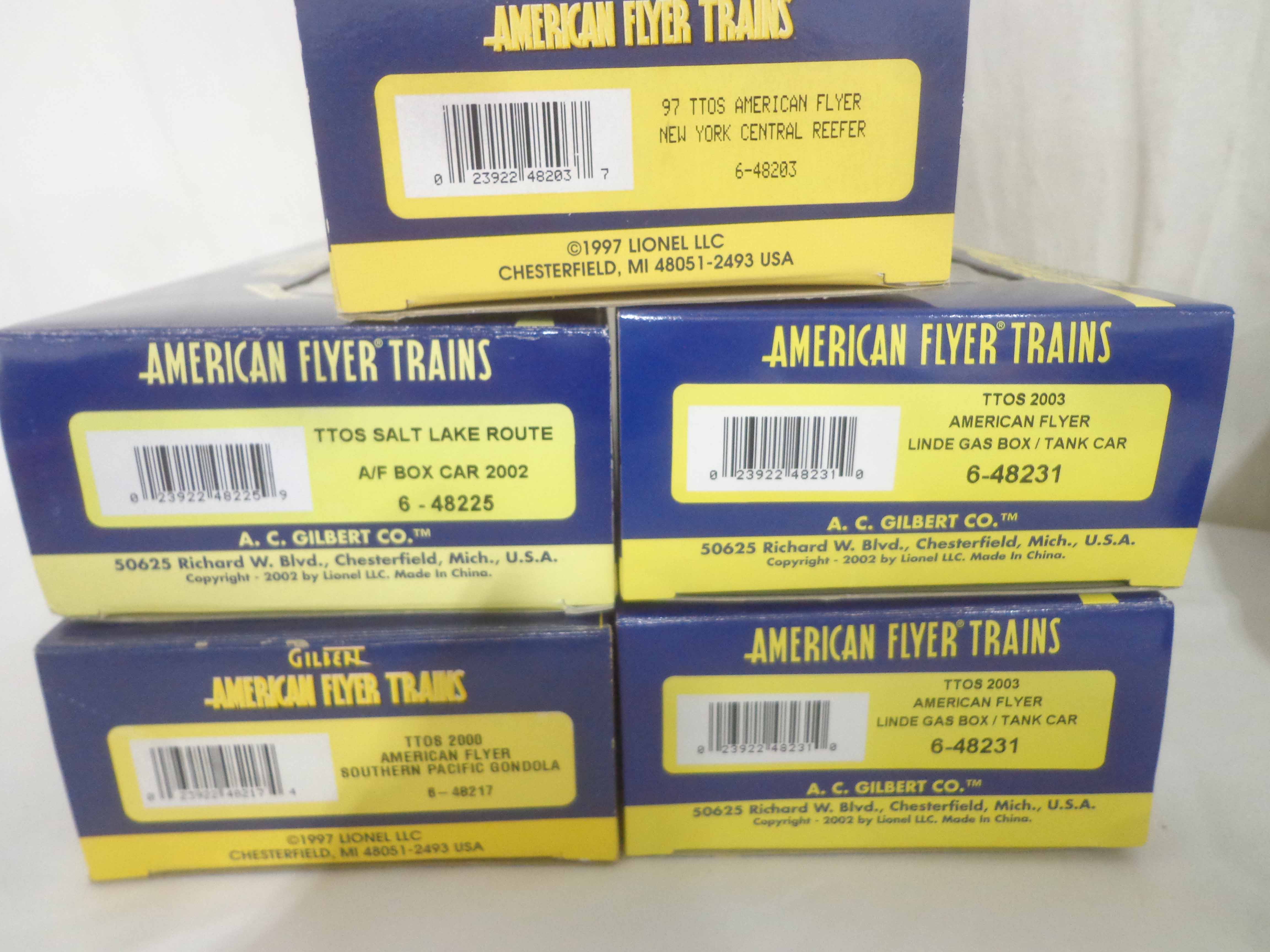These are thirteen Assorted TTOS Freight Cars that Lionel/American Flyer made in S Gauge in the 1990s. Original Boxes. Examine very closely; what is pictured is what you will receive. Please add $50.00 for US-48 Shipping and Insurance (more west of the Mississippi). 13 AF/Lionel S Gauge Assorted TTOS Freight Cars, OBs Gail