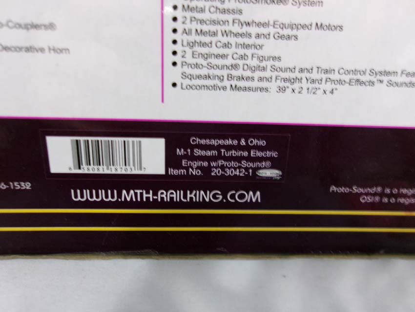 These are the #20-3042-1 C&O 4-8-8-4 M-1 Turbine Scale Steam Engine and Tender that MTH made a few years ago. Our Opinion is that they are generally in Like New Condition. Original Boxes. All Original in our Opinion. Please add $50.00 for US-48 Shipping and Insurance (more west of the Mississippi). |