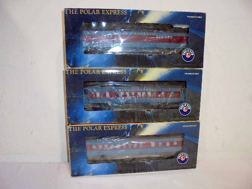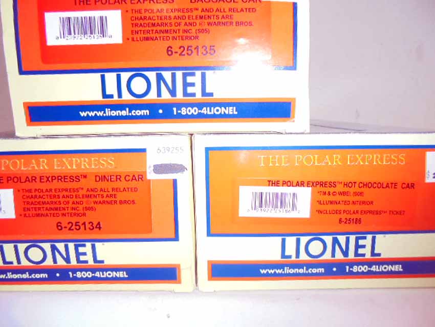 Lionel #25134 Polar Express Diner Car, #25135 Polar Express Baggage Car, and #25186 Polar Express Hot Chocolate Car, OBs
