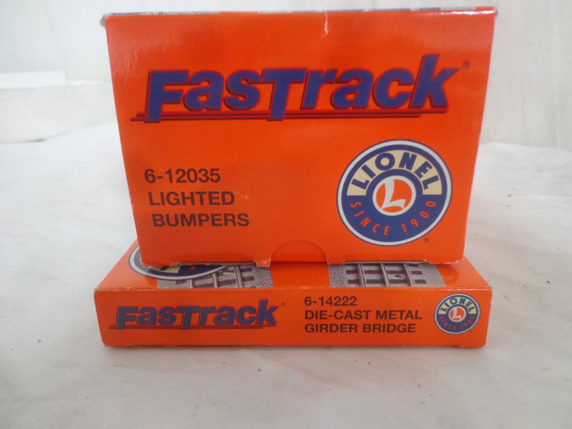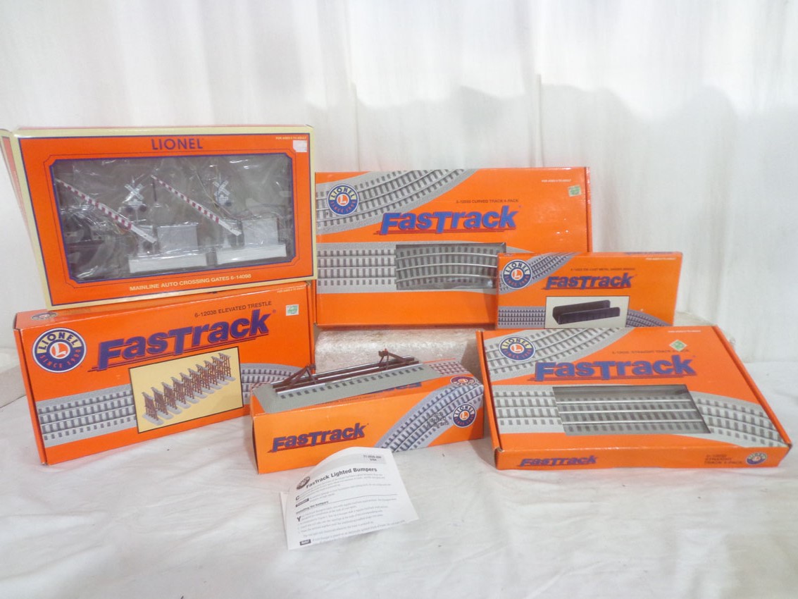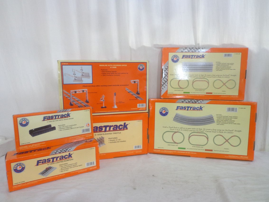 These are six Lionel/Lionel Fastrack Assorted Track, Track Accessories and Mainline Crossing Gates. Our Opinion is that they are generally in Like New Condition. Original Boxes. All Original in our Opinion. Please add $40.00 for US-48 Shipping and Insurance (more west of the Mississippi). 6 Lionel/Lionel Fastrack Assorted Track, Track Accessories and Mainline Crossing Gates, OBs Gail