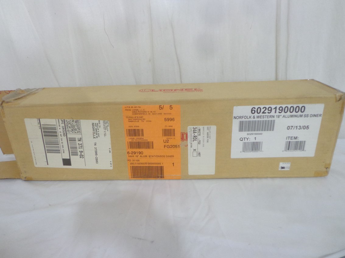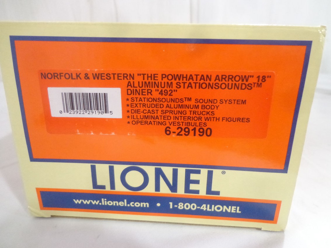 These are the #29190 Norfolk and Western Powhatan Arrow Aluminum Diner with Stationsounds that Lionel made a few years ago. Our Opinion is that they are generally in Like New Condition. Original Box. All Original in our Opinion. Please add $35.00 for US-48 Shipping and Insurance (more west of the Mississippi).
