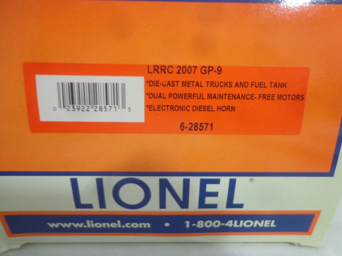 This is the Lionel #28571 LRRC GP-9 Engine with dual motors and electronic horn. Our Opinion is that it is generally in Like New Condition. No Boxes. Examine closely; what is pictured is what you will receive. Please add $35.00 for US-48 Shipping and Insurance (more west of the Mississippi).