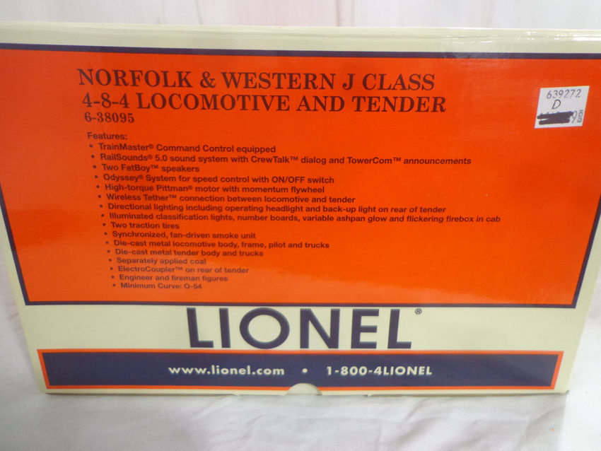 These are the #38095 Norfolk & Western 4-8-4 Scale J Class Steam Engine & Tender that Lionel made a few years ago. Features Command Control, Electrocoupler, Wireless Tether, Two Big Boy Speakers, Directional Lighting and Railsounds. Our Opinion is that they are generally in Like New Condition. Original Box. All Original in our Opinion. Please add $45.00 for US-48 Shipping and Insurance (more west of the Mississippi).