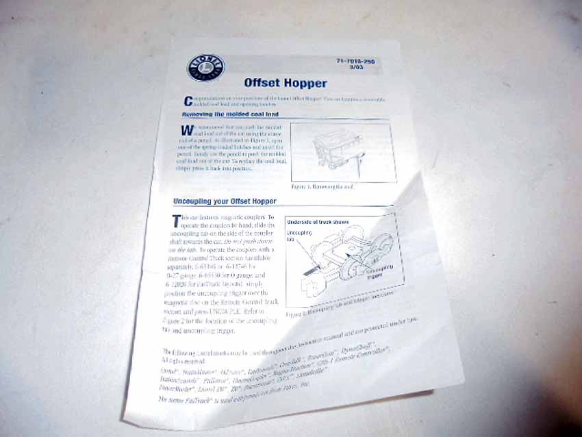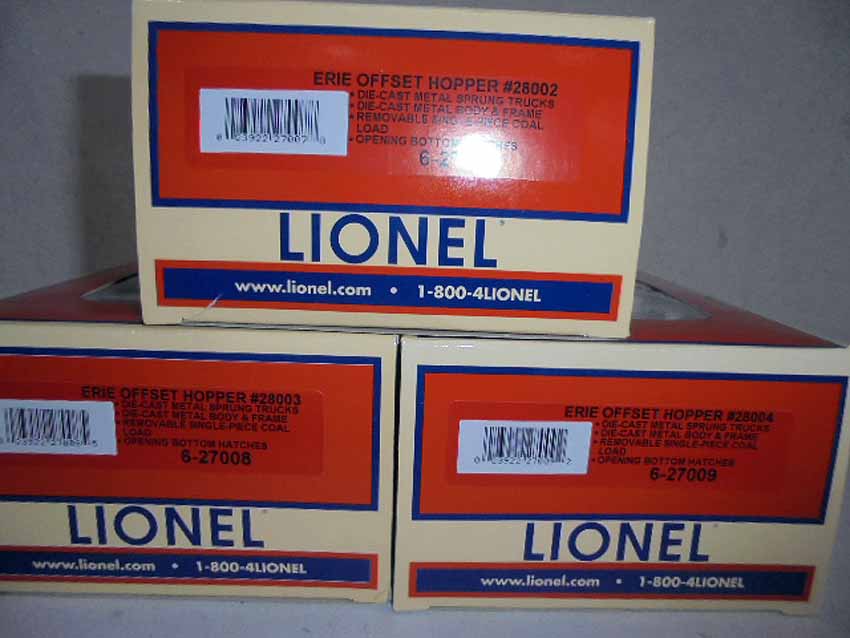 These are the Lionel #21880 Erie Offset Hopper 3-Pack Set from the recent years. Our Opinion is that the Set is generally in Like New Condition. Original Boxes. All Original in our Opinion. Please add $40.00 for US-48 Shipping and Insurance (more west of the Mississippi).