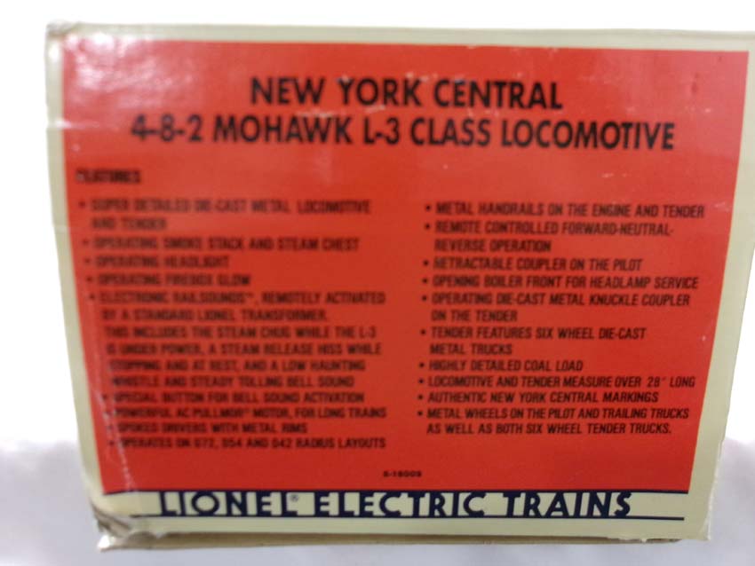 These are the #18009 New York Central Diecast L-3 Mohawk Steam Engine and Diecast Tender that Lionel made in the 1980s. Smoke, Railsounds and Firebox Glow. Our Opinion is that they are generally in Like New Condition. Original Box. All Original in our Opinion. Please add $50.00 for US-48 Shipping and Insurance (more west of the Mississippi).